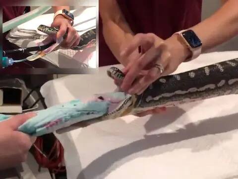 ਵਾਇਰਲ ਵੀਡੀਓ 'ਚ ਕੁਝ ਮਹਿਲਾ ਡਾਕਟਰ ਅਤੇ ਸਰਜਰੀ ਟੇਬਲ 'ਤੇ ਪਿਆ ਇੱਕ ਸੱਪ ਦਿਖ ਰਿਹਾ ਹੈ। ਸੱਪ ਦੇ ਮੂੰਹ 'ਚ ਕੁਝ ਔਜ਼ਾਰ ਪਾ ਕੇ ਪੇਟ 'ਚੋਂ ਕੁਝ ਕੱਢਣ ਦੀ ਕੋਸ਼ਿਸ਼ ਕਰਦੇ ਨਜ਼ਰ ਆ ਰਹੇ ਹਨ। ਅਸਲ 'ਚ ਸੱਪ ਦੇ ਪੇਟ 'ਚ ਇੱਕ ਕੰਬਲ ਮਿਲਿਆ ਸੀ, ਜਿਸ ਨੂੰ ਉਸ ਨੇ ਗਲਤੀ ਨਾਲ ਨਿਗਲ ਲਿਆ ਸੀ। ਪਰ ਸੱਪ ਦੀ ਗਲਤੀ ਦਾ ਪਤਾ ਲੱਗਣ ਤੋਂ ਬਾਅਦ ਜਦੋਂ ਮਹਿਲਾ ਡਾਕਟਰਾਂ ਨੇ ਇਸ ਨੂੰ ਪੇਟ 'ਚੋਂ ਕੱਢਣ ਦੀ ਕੋਸ਼ਿਸ਼ ਕੀਤੀ ਤਾਂ ਉਨ੍ਹਾਂ ਦੀ ਹਾਲਤ ਵਿਗੜ ਗਈ। ਵੀਡੀਓ ਵਿੱਚ ਤੁਸੀਂ ਦੇਖ ਸਕੋਗੇ ਕਿ ਇੱਕ ਵਾਰ ਉਸ ਕੰਬਲ ਨੂੰ ਖਿੱਚਣ ਦੀ ਪ੍ਰਕਿਰਿਆ ਵਿੱਚ ਡਾਕਟਰ ਦਾ ਸੰਦ ਟੁੱਟ ਗਿਆ ਸੀ, ਪਰ ਡਾਕਟਰਾਂ ਨੇ ਹਿੰਮਤ ਨਹੀਂ ਹਾਰੀ ਅਤੇ ਜਿਵੇਂ ਹੀ ਕੰਬਲ ਥੋੜ੍ਹਾ ਜਿਹਾ ਦਿਖਾਈ ਦਿੱਤਾ, ਉਸ ਨੂੰ ਹੱਥ ਤੋਂ ਫੜ ਕੇ ਖਿੱਚ ਲਿਆ। ਜਿਵੇਂ ਹੀ ਸੱਪ ਦੇ ਪੇਟ 'ਚੋਂ ਪੂਰਾ ਕੰਬਲ ਬਾਹਰ ਆਇਆ ਤਾਂ ਮਹਿਲਾ ਡਾਕਟਰਾਂ ਨੇ ਸੁੱਖ ਦਾ ਸਾਹ ਲਿਆ ਅਤੇ ਇਕ-ਦੂਜੇ ਨੂੰ ਜੱਫੀ ਪਾ ਕੇ ਖੁਸ਼ੀ ਦਾ ਇਜ਼ਹਾਰ ਕੀਤਾ।