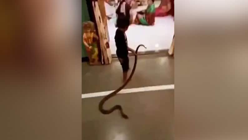 ਵੀਡੀਓ 'ਚ ਇੱਕ ਬੱਚਾ ਸੱਪ ਨੂੰ ਰੱਸੀ ਦੀ ਤਰ੍ਹਾਂ ਖਿੱਚਦਾ ਨਜ਼ਰ ਆ ਰਿਹਾ ਹੈ। ਉਸ ਨੇ ਸੱਪ ਦੀ ਪੂਛ ਫੜੀ ਹੋਈ ਸੀ। ਘਰ ਦਾ ਫਰਸ਼ ਚਿੱਟੀਆਂ ਟਾਈਲਾਂ ਨਾਲ ਢੱਕਿਆ ਹੋਇਆ ਸੀ, ਜਿਸ 'ਤੇ ਸੱਪ ਤਿਲਕ ਰਿਹਾ ਸੀ। ਵੀਡੀਓ 'ਚ ਇੱਕ ਸਮਾਂ ਅਜਿਹਾ ਵੀ ਸੀ ਜਦੋਂ ਬੱਚੇ ਨੇ ਸੱਪ ਦੇ ਮੂੰਹ 'ਤੇ ਪੈਰ ਰੱਖਿਆ ਸੀ। ਜੇਕਰ ਬੱਚੇ ਨੂੰ ਸੱਪ ਨੇ ਡੰਗ ਲਿਆ ਹੁੰਦਾ ਤਾਂ ਵੱਡਾ ਹਾਦਸਾ ਹੋ ਸਕਦਾ ਸੀ। ਬੱਚਾ ਸੱਪ ਦੇ ਨਾਲ ਪੂਜਾ ਕਮਰੇ ਵਿੱਚ ਦਾਖਲ ਹੋਇਆ ਜਿੱਥੇ ਔਰਤਾਂ ਪੂਜਾ ਕਰ ਰਹੀਆਂ ਸਨ। ਪਰ ਸੱਪ ਨੂੰ ਦੇਖ ਕੇ ਸਾਰੇ ਡਰਦੇ ਮਾਰੇ ਭੱਜਣ ਲੱਗੇ।