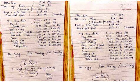 ਟਾਈਮ ਟੇਬਲ 'ਤੇ ਦੇਖਿਆ ਜਾ ਸਕਦਾ ਹੈ ਕਿ ਅਲਾਰਮ ਦਾ ਸਮਾਂ ਸਵੇਰੇ 7:50 ਵਜੇ ਦਾ ਹੈ, ਜਦੋਂ ਕਿ ਮੰਜੇ ਤੋਂ ਉੱਠਣ ਦਾ ਸਮਾਂ ਸਵੇਰੇ 8:00 ਵਜੇ ਤੱਕ ਰੱਖਿਆ ਗਿਆ ਹੈ। ਇਸ ਤੋਂ ਬਾਅਦ ਬੁਰਸ਼, ਨਾਸ਼ਤਾ, ਟੀਵੀ ਦੇਖਣਾ, ਫਲ ਖਾਣਾ, ਖੇਡਣਾ, ਦੁੱਧ ਪੀਣਾ, ਟੈਨਿਸ ਖੇਡਣਾ, ਹੋਮਵਰਕ ਕਰਨਾ, ਰਾਤ ਦਾ ਖਾਣਾ, ਸਫਾਈ, ਸੌਣ ਦਾ ਸਮਾਂ ਆਦਿ ਲਿਖਿਆ ਜਾਂਦਾ ਹੈ। ਇੰਨਾ ਹੀ ਨਹੀਂ, ਸਭ ਤੋਂ ਮਜ਼ੇਦਾਰ ਗੱਲ ਇਹ ਹੈ ਕਿ ਜੇਕਰ ਤੁਸੀਂ ਪੂਰਾ ਦਿਨ ਬਿਨਾਂ ਰੋਏ, ਰੌਲਾ ਪਾਏ, ਬਿਨਾਂ ਭੰਨ-ਤੋੜ ਕੀਤੇ ਬਿਤਾਉਂਦੇ ਹੋ ਤਾਂ ਤੁਹਾਨੂੰ 10 ਰੁਪਏ ਮਿਲਣਗੇ। ਇੰਨਾ ਹੀ ਨਹੀਂ, ਜੇਕਰ ਰੁਟੀਨ ਦੀ ਪਾਲਣਾ ਕਰਦੇ ਹੋਏ, ਬਿਨਾਂ ਰੋਏ, ਰੌਲਾ ਪਾਏ ਅਤੇ ਬਿਨਾਂ ਲੜੇ, ਲਗਾਤਾਰ 7 ਦਿਨ ਬਿਤਾਉਂਦਾ ਹੈ ਤਾਂ ਤੁਹਾਨੂੰ 100 ਰੁਪਏ ਮਿਲਣਗੇ।