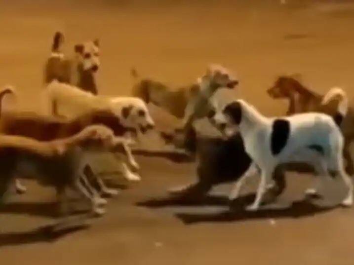 ਵੀਡੀਓ ਬਾਰੇ ਵਿਸਥਾਰ ਵਿੱਚ ਜਾਣੋ। ਸੋਸ਼ਲ ਮੀਡੀਆ 'ਤੇ ਵਾਇਰਲ ਹੋਈ ਵੀਡੀਓ 'ਚ ਤੁਸੀਂ ਦੋ ਗਰੋਹਾਂ 'ਚ 8-10 ਕੁੱਤੇ ਭੌਂਕਦੇ ਦੇਖ ਸਕਦੇ ਹੋ। ਦੋਵੇਂ ਗਰੋਹਾਂ ਦੇ ਕੁੱਤੇ ਆਹਮੋ-ਸਾਹਮਣੇ ਹਨ ਅਤੇ ਉੱਚੀ-ਉੱਚੀ ਭੌਂਕ ਰਹੇ ਹਨ। ਉਨ੍ਹਾਂ ਨੂੰ ਦੇਖ ਕੇ ਇੰਝ ਲੱਗਦਾ ਹੈ ਜਿਵੇਂ ਉਹ ਇੱਕ ਦੂਜੇ ਦੇ ਖੂਨ ਦੇ ਪਿਆਸੇ ਹੋਣ।