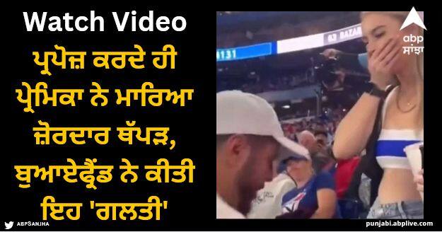 Viral Video: ਵੈਲੇਨਟਾਈਨ ਵੀਕ ਦੇ ਵਿਚਕਾਰ ਸੋਸ਼ਲ ਮੀਡੀਆ 'ਤੇ ਇੱਕ ਵੀਡੀਓ ਸਾਹਮਣੇ ਆਇਆ ਹੈ, ਜੋ ਕਿਸੇ ਰੋਮਾਂਟਿਕ ਕਹਾਣੀ ਦੀ ਸ਼ੁਰੂਆਤ ਵਾਂਗ ਲੱਗ ਰਿਹਾ ਹੈ। ਹਾਲਾਂਕਿ, ਵਾਇਰਲ ਕਲਿੱਪ ਵਿੱਚ ਅਗਲੇ ਪਲ ਵਿੱਚ ਕੀ ਹੁੰਦਾ ਹੈ, ਇਹ ਦੇਖ ਕੇ ਨੇਟੀਜ਼ਨ ਦੰਗ ਰਹਿ ਗਏ ਹਨ। ਹੋਇਆ ਇਹ ਕਿ ਖਚਾਖਚ ਭਰੇ ਸਟੇਡੀਅਮ 'ਚ ਇੱਕ ਵਿਅਕਤੀ ਨੇ ਅਚਾਨਕ ਗੋਡਿਆਂ ਭਾਰ ਹੋ ਕੇ ਆਪਣੀ ਪ੍ਰੇਮਿਕਾ ਨੂੰ ਪ੍ਰਪੋਜ਼ ਕੀਤਾ। ਇਹ ਦੇਖ ਕੇ ਕੁੜੀ ਪਹਿਲਾਂ ਤਾਂ ਖੁਸ਼ ਹੋ ਜਾਂਦੀ ਹੈ। ਫਿਰ ਉਹ ਵਿਅਕਤੀ ਨੂੰ ਜ਼ੋਰਦਾਰ ਥੱਪੜ ਮਾਰਦੀ ਹੈ।