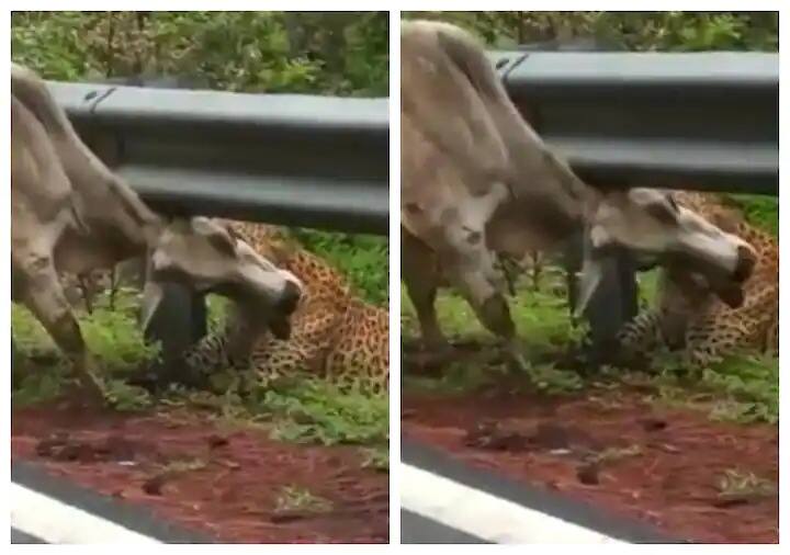 IFS ਅਧਿਕਾਰੀ ਸਾਕੇਤ ਬਡੋਲਾ ਨੇ ਟਵਿੱਟਰ 'ਤੇ ਇਸ ਪਰੇਸ਼ਾਨ ਕਰਨ ਵਾਲੀ ਵੀਡੀਓ ਨੂੰ ਸਾਂਝਾ ਕੀਤਾ ਹੈ। ਵੀਡੀਓ 'ਚ ਗਾਂ ਨੂੰ ਸੜਕ ਕਿਨਾਰੇ ਜੰਗਲ 'ਚ ਖੜ੍ਹੀ ਦੇਖਿਆ ਜਾ ਸਕਦਾ ਹੈ। ਇਹ ਗਾਂ ਚੀਤੇ ਦੀ ਮਾਰੂ ਪਕੜ ਵਿੱਚ ਹੈ ਕਿਉਂਕਿ ਚੀਤਾ ਆਪਣੇ ਜਬਾੜੇ ਨਾਲ ਗਾਂ ਨੂੰ ਗਰਦਨ ਵਾਲੇ ਪਾਸੇ ਤੋਂ ਫੜਦਾ ਰਹਿੰਦਾ ਹੈ। ਜੰਗਲੀ ਚੀਤਾ ਗਾਂ ਨੂੰ ਰੇਲਿੰਗ ਹੇਠੋਂ ਕੱਢਣ ਦੀ ਬਹੁਤ ਕੋਸ਼ਿਸ਼ ਕਰ ਰਿਹਾ ਸੀ ਪਰ ਗਾਂ ਭੱਜਣ ਦੀ ਕੋਸ਼ਿਸ਼ ਕਰ ਰਹੀ ਸੀ। ਹਾਲਾਂਕਿ, ਅੰਤ ਵਿੱਚ ਇਹ ਜੰਗਲੀ ਚੀਤਾ ਗਾਂ ਨੂੰ ਖਿੱਚ ਕੇ ਲੈ ਜਾਂਦਾ ਹੈ।