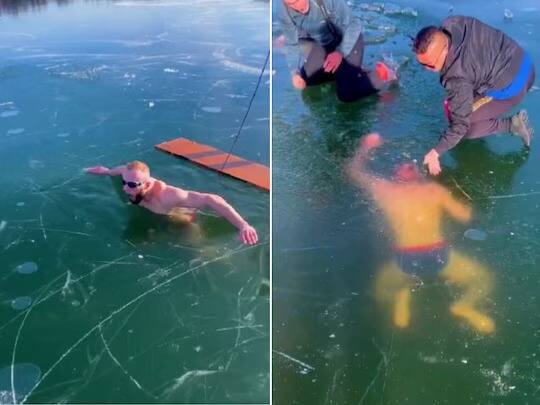 Viral Video: ਦੁਨੀਆ ਵਿੱਚ ਬਹੁਤ ਸਾਰੇ ਲੋਕ ਅਜਿਹੇ ਹਨ ਜਿਨ੍ਹਾਂ ਐਡਵੈਂਚਰ ਕਰਨਾ ਬਹੁਤ ਪਸੰਦ ਹੁੰਦਾ ਹੈ। ਆਪਣੀ ਜਾਨ ਨੂੰ ਖ਼ਤਰੇ ਵਿੱਚ ਪਾ ਕੇ ਵੀ ਉਹ ਅਜਿਹੇ ਕੰਮ ਕਰਦੇ ਹਨ ਜੋ ਬੇਹੱਦ ਖ਼ਤਰਨਾਕ ਹੁੰਦੇ ਹਨ। ਜਦੋਂ ਤੋਂ ਲੋਕਾਂ ਨੂੰ ਸੋਸ਼ਲ ਮੀਡੀਆ 'ਤੇ ਵਾਇਰਲ ਹੋਣ ਦਾ ਖ਼ਿਆਲ ਆਇਆ ਹੈ, ਉਦੋਂ ਤੋਂ ਹੀ ਐਡਵੈਂਚਰ ਕਰਨ ਦਾ ਖ਼ਿਆਲ ਹਰ ਸਮੇਂ ਲੋਕਾਂ ਦੇ ਮਨਾਂ 'ਚ ਘੁੰਮਦਾ ਰਹਿੰਦਾ ਹੈ। ਅਜਿਹਾ ਹੀ ਕੁਝ ਇੱਕ ਵਿਅਕਤੀ ਨੇ ਵੀ ਕੀਤਾ, ਜਿਸ ਨੇ ਤੈਰਨ ਲਈ ਜੰਮੀ ਹੋਈ ਝੀਲ 'ਚ ਛਾਲ ਮਾਰ ਦਿੱਤੀ। ਪਰ ਫਿਰ ਉਹ ਆਪਣਾ ਰਾਹ ਭੁੱਲ ਗਿਆ। ਇਸ ਵੀਡੀਓ ਨੂੰ ਦੇਖ ਕੇ ਲੱਗਦਾ ਹੈ ਕਿ ਇਸ ਨੂੰ ਮਨੋਰੰਜਨ ਦੇ ਮਕਸਦ ਨਾਲ ਬਣਾਇਆ ਗਿਆ ਹੈ ਪਰ ਇਸ ਤਰ੍ਹਾਂ ਜੰਮੀ ਝੀਲ ਦੇ ਅੰਦਰ ਤੈਰਨਾ ਅਸਲ 'ਚ ਕਾਫੀ ਖਤਰਨਾਕ ਹੋ ਸਕਦਾ ਹੈ।