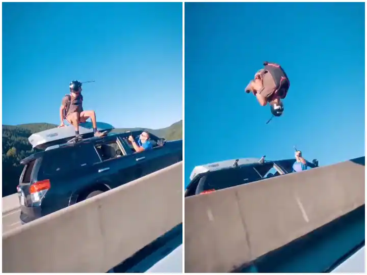 ਵੀਡੀਓ ਵਿੱਚ ਦੇਖਿਆ ਜਾ ਸਕਦਾ ਹੈ ਕਿ ਇੱਕ ਪੁਲ ਨਜ਼ਰ ਆ ਰਿਹਾ ਹੈ ਉਦੋਂ ਇੱਕ ਕਾਰ ਤੇਜ਼ ਰਫ਼ਤਾਰ ਨਾਲ ਉੱਥੇ ਆ ਜਾਂਦੀ ਹੈ। ਕਾਰ ਦੀ ਛੱਤ 'ਤੇ ਇਕ ਆਦਮੀ ਬੈਠਾ ਹੈ। ਆਦਮੀ ਬਿਨਾਂ ਕੁਝ ਸੋਚੇ ਚੱਲਦੇ ਵਾਹਨ ਤੋਂ ਪੁਲ ਦੇ ਹੇਠਾਂ ਛਾਲ ਮਾਰ ਦਿੰਦਾ ਹੈ। ਜਿਵੇਂ ਹੀ ਉਹ ਪੁਲ ਦੇ ਹੇਠਾਂ ਛਾਲ ਮਾਰਦਾ ਹੈ, ਉਹ ਪਲਟ ਜਾਂਦਾ ਹੈ ਅਤੇ ਥੋੜਾ ਜਿਹਾ ਹੇਠਾਂ ਜਾਣ ਤੋਂ ਬਾਅਦ ਪੈਰਾਸ਼ੂਟ ਖੋਲ੍ਹਦਾ ਹੈ। ਵੀਡੀਓ 'ਚ ਵਿਅਕਤੀ ਨੂੰ ਕਾਰ ਤੋਂ ਛਾਲ ਮਾਰਦੇ ਦੇਖ ਲੋਕ ਹੈਰਾਨ ਹਨ। ਵੀਡੀਓ ਸੱਚਮੁੱਚ ਹੈਰਾਨ ਕਰਨ ਵਾਲੀ ਹੈ। ਤੁਸੀਂ ਵੀ ਦੇਖੋ ਇਹ ਵੀਡੀਓ।