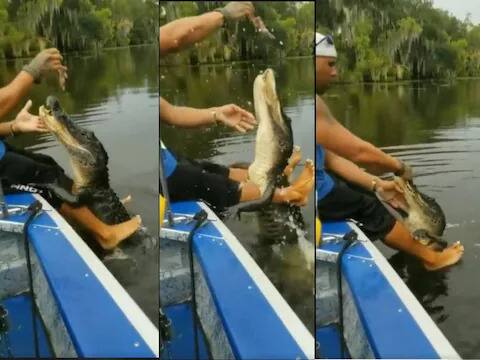 ਵੀਡੀਓ 'ਚ ਕਿਸ਼ਤੀ 'ਤੇ ਬੈਠੇ ਇੱਕ ਵਿਅਕਤੀ ਨੂੰ ਆਪਣੀਆਂ ਲੱਤਾਂ ਹੇਠਾਂ ਲਟਕਾ ਕੇ ਮਗਰਮੱਛ ਨੂੰ ਆਪਣੇ ਵੱਲ ਬੁਲਾਉਂਦੇ ਦੇਖਿਆ ਜਾ ਸਕਦਾ ਹੈ। ਉਸ ਦੇ ਹੱਥ ਵਿੱਚ ਮਾਸ ਦਾ ਇੱਕ ਛੋਟਾ ਜਿਹਾ ਟੁਕੜਾ ਹੈ, ਜਿਸ ਨੂੰ ਦਿਖਾਉਂਦਾ ਹੈ ਕਿ ਉਹ ਮਗਰਮੱਛ ਨੂੰ ਲੁਭਾਉਂਦਾ ਹੈ ਅਤੇ ਉਹ ਭੱਜ ਕੇ ਉਸ ਵਿਅਕਤੀ ਕੋਲ ਜਾਂਦਾ ਹੈ। ਇਸ ਦੌਰਾਨ ਉਹ ਉਸ ਨੂੰ ਬੱਚਿਆਂ ਵਾਂਗ ਆਪਣੇ ਪੈਰਾਂ 'ਤੇ ਦਬਾ ਕੇ ਖੇਡਣ ਲੱਗ ਜਾਂਦਾ ਹੈ। ਉਸ ਨੂੰ ਖਾਣ ਲਈ ਲੁਭਾਉਣ ਤੋਂ ਬਾਅਦ, ਉਹ ਉਸ ਨੂੰ ਉਹ ਟੁਕੜਾ ਖੁਆਉਂਦਾ ਹੈ ਅਤੇ ਉਸ ਦੇ ਸਿਰ 'ਤੇ ਪਿਆਰ ਨਾਲ ਥੱਪੜ ਦਿੰਦਾ ਹੈ। ਇਸ ਤੋਂ ਬਾਅਦ ਮਗਰਮੱਛ ਵੀ ਪਾਣੀ ਵਿੱਚ ਆਰਾਮ ਨਾਲ ਤੈਰ ਕੇ ਉੱਥੋਂ ਚਲਾ ਜਾਂਦਾ ਹੈ। ਖੌਫਨਾਕ ਮਗਰਮੱਛ ਨੂੰ ਵਿਅਕਤੀ ਦੇ ਸਾਹਮਣੇ ਇੰਨੀ ਸ਼ਾਂਤੀ ਨਾਲ ਦੇਖ ਕੇ ਹਰ ਕੋਈ ਹੈਰਾਨ ਰਹਿ ਗਿਆ।