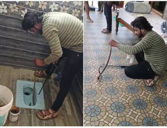 Shocking Viral Video: ਅਸੀਂ ਅਕਸਰ ਇੰਟਰਨੈੱਟ 'ਤੇ ਅਜਿਹੀਆਂ ਵੀਡੀਓਜ਼ ਦੇਖਦੇ ਹਾਂ, ਜਿਨ੍ਹਾਂ ਨੂੰ ਦੇਖ ਕੇ ਯੂਜ਼ਰਸ ਹੱਸਦੇ ਹਨ। ਅਜਿਹੇ ਡਰਾਉਣੇ ਅਤੇ ਹੈਰਾਨ ਕਰਨ ਵਾਲੇ ਵੀਡੀਓ ਸੋਸ਼ਲ ਮੀਡੀਆ 'ਤੇ ਆਏ ਦਿਨ ਸਾਹਮਣੇ ਆਉਂਦੇ ਰਹਿੰਦੇ ਹਨ। ਹਾਲ ਹੀ 'ਚ ਅਜਿਹਾ ਹੀ ਇਕ ਵੀਡੀਓ ਸੋਸ਼ਲ ਮੀਡੀਆ 'ਤੇ ਸਾਹਮਣੇ ਆਇਆ ਹੈ। ਜਿਸ ਵਿੱਚ ਇੱਕ ਵਿਅਕਤੀ ਕਿੰਗ ਕੋਬਰਾ ਨੂੰ ਬਚਾਉਂਦਾ ਨਜ਼ਰ ਆ ਰਿਹਾ ਹੈ। ਹੈਰਾਨੀ ਦੀ ਗੱਲ ਹੈ ਕਿ ਵੀਡੀਓ 'ਚ ਸ਼ਖਸ ਟਾਇਲਟ ਸੀਟ ਦੇ ਅੰਦਰ ਲੁਕੇ ਕਿੰਗ ਕੋਬਰਾ ਨੂੰ ਬਚਾਉਂਦੇ ਹੋਏ ਨਜ਼ਰ ਆ ਰਹੇ ਹਨ।