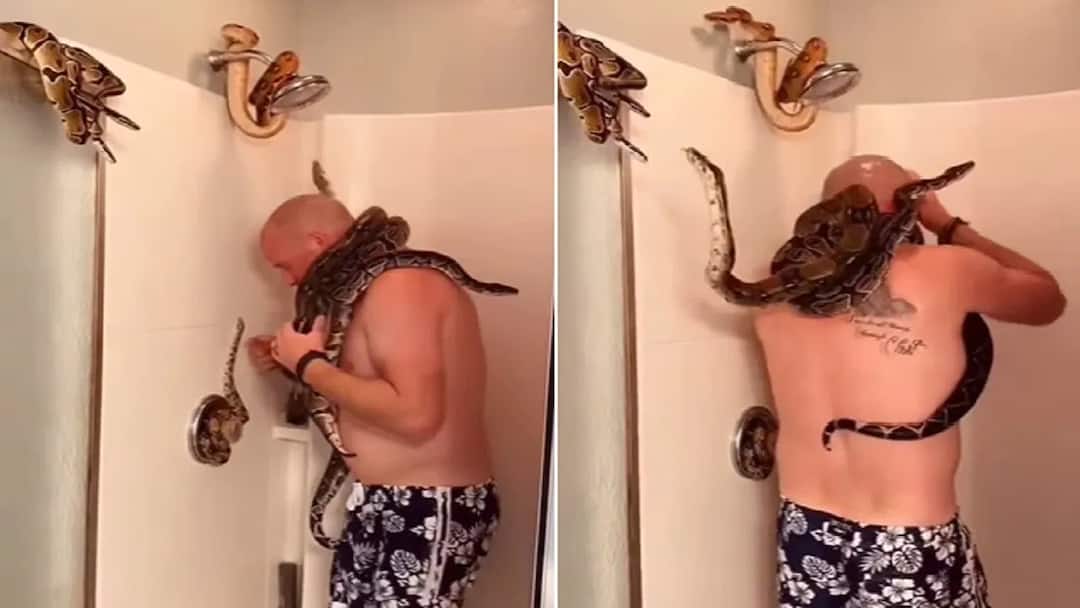 ਵਾਇਰਲ ਹੋ ਰਹੀ ਵੀਡੀਓ ਵਿੱਚ ਦੇਖਿਆ ਜਾ ਸਕਦਾ ਹੈ ਕਿ ਇੱਕ ਵਿਅਕਤੀ ਇੱਕੋ ਸਮੇਂ 2-3 ਸੱਪਾਂ ਨੂੰ ਆਪਣੇ ਗਲੇ ਵਿੱਚ ਲਪੇਟ ਰਿਹਾ ਹੈ। ਉਸਦੇ ਪੂਰੇ ਬਾਥਰੂਮ ਵਿੱਚ ਸੱਪ ਹਨ। ਇੱਕ ਸੱਪ ਟੂਟੀ ਦੇ ਉੱਪਰ ਲਪੇਟਿਆ ਹੋਇਆ ਹੈ, ਇੱਕ ਸੱਪ ਸ਼ਾਵਰ ਦੇ ਉੱਪਰ ਬੈਠਾ ਹੈ, ਫਿਰ 2 ਸੱਪ ਦਰਵਾਜ਼ੇ ਦੇ ਉੱਪਰ ਲਪੇਟੇ ਹੋਏ ਹਨ। ਇਹ ਆਦਮੀ ਉਨ੍ਹਾਂ ਵਿਚਕਾਰ ਇਸ਼ਨਾਨ ਕਰ ਰਿਹਾ ਹੈ ਅਤੇ ਉਨ੍ਹਾਂ ਨੂੰ ਬੁਲਾ ਰਿਹਾ ਹੈ। ਹਾਲਾਂਕਿ ਇਹ ਅਜਗਰ ਨਜ਼ਰ ਆ ਰਹੇ ਹਨ, ਜਿਨ੍ਹਾਂ ਵਿੱਚ ਜ਼ਹਿਰ ਨਹੀਂ ਹੈ ਪਰ ਫਿਰ ਵੀ ਬਹੁਤ ਖਤਰਨਾਕ ਹੈ। ਉਹ ਕਿਸੇ ਦੇ ਗਲ ਨਾਲ ਚਿੰਬੜ ਕੇ ਉਸ ਦੀ ਜਾਨ ਵੀ ਲੈ ਸਕਦੇ ਹਨ।