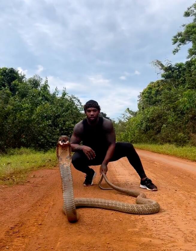ਵਾਇਰਲ ਹੋ ਰਹੀ ਇਸ ਵੀਡੀਓ 'ਚ ਤੁਸੀਂ ਦੇਖ ਸਕਦੇ ਹੋ ਕਿ ਖਾਲੀ ਸੜਕ 'ਤੇ ਇਕ ਆਦਮੀ ਵੱਡੇ ਕਿੰਗ ਕੋਬਰਾ ਨਾਲ ਨਜ਼ਰ ਆ ਰਿਹਾ ਹੈ। ਆਦਮੀ ਨੇ ਆਪਣੀ ਸੱਪ ਦੀ ਪੂਛ ਨੂੰ ਆਪਣੇ ਹੱਥਾਂ ਨਾਲ ਫੜ ਲਿਆ ਹੈ। ਪਰ, ਉਹ ਇਸ ਕਈ ਫੁੱਟ ਲੰਬੇ ਕੋਬਰਾ ਨੂੰ ਪੂਰੀ ਤਰ੍ਹਾਂ ਫੜ ਕੇ ਆਪਣੇ ਹੱਥਾਂ ਵਿੱਚ ਲੈਣ ਦੀ ਕੋਸ਼ਿਸ਼ ਕਰ ਰਿਹਾ ਹੈ। ਤੁਸੀਂ ਦੇਖ ਸਕਦੇ ਹੋ ਕਿ ਕਿਸ ਤਰ੍ਹਾਂ ਕਿੰਗ ਕੋਬਰਾ ਗੁੱਸੇ 'ਚ ਆਪਣੀ ਫੱਨ ਫੈਲਾਉਂਦਾ ਨਜ਼ਰ ਆ ਰਿਹਾ ਹੈ। ਜਿਵੇਂ ਹੀ ਉਹ ਵਿਅਕਤੀ ਇਸ ਨੂੰ ਪਿੱਛੇ ਤੋਂ ਫੜ ਕੇ ਆਪਣੇ ਹੱਥਾਂ ਵਿੱਚ ਲੈ ਲੈਂਦਾ ਹੈ। ਕੋਬਰਾ ਗੁੱਸੇ ਨਾਲ ਹਵਾ ਵਿਚ ਛਾਲ ਮਾਰਦਾ ਹੈ ਅਤੇ ਮੁੜ ਕੇ ਵਿਅਕਤੀ 'ਤੇ ਹਮਲਾ ਕਰਦਾ ਹੈ। ਆਦਮੀ ਡਰ ਕੇ ਪਿੱਛੇ ਨੂੰ ਭੱਜਦਾ ਹੈ। ਜਦੋਂ ਉਹ ਵਿਅਕਤੀ ਉਸ ਨੂੰ ਦੁਬਾਰਾ ਫੜਨ ਦੀ ਕੋਸ਼ਿਸ਼ ਕਰਦਾ ਹੈ, ਤਾਂ ਉਹ ਉਸ ਵਿਅਕਤੀ 'ਤੇ ਦੁਬਾਰਾ ਹਮਲਾ ਕਰਦਾ ਹੈ।