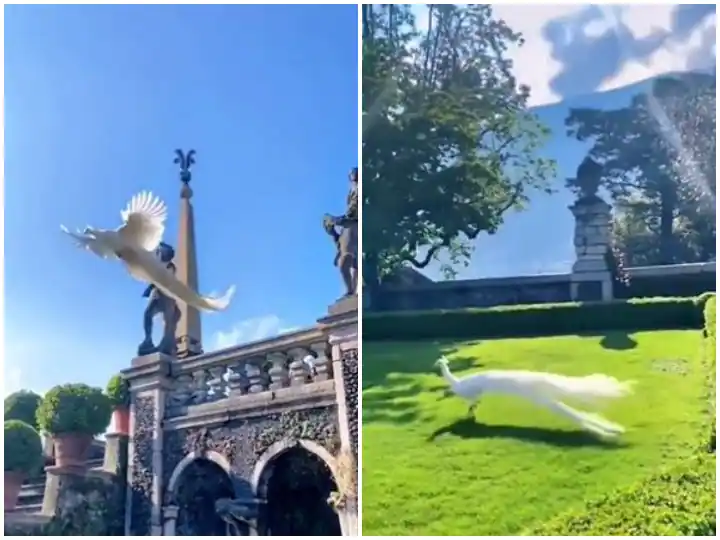 ਵਾਇਰਲ ਵੀਡੀਓ 'ਚ ਨਜ਼ਰ ਆ ਰਿਹਾ ਮੋਰ ਸਫੇਦ ਰੰਗ ਦਾ ਹੈ। ਆਮ ਤੌਰ 'ਤੇ ਅਸੀਂ ਸਾਰਿਆਂ ਨੇ ਰੰਗੀਨ ਖੰਭਾਂ ਵਾਲੇ ਨੀਲੇ ਅਤੇ ਹਰੇ ਮੋਰ ਦੇਖੇ ਹੋਣਗੇ। ਮੌਜੂਦਾ ਸਮੇਂ 'ਚ ਸਫੈਦ ਮੋਰ ਵੀ ਆਪਣੀ ਬਣਤਰ ਕਾਰਨ ਸਭ ਨੂੰ ਮੋਹਿਤ ਕਰਦਾ ਨਜ਼ਰ ਆ ਰਿਹਾ ਹੈ। ਕੁਝ ਰਿਪੋਰਟਾਂ ਸੁਝਾਅ ਦਿੰਦੀਆਂ ਹਨ ਕਿ ਚਿੱਟਾ ਮੋਰ ਇਕ ਬਹੁਤ ਹੀ ਦੁਰਲੱਭ ਜੀਵ ਹੈ। ਵੀਡੀਓ ਨੂੰ ਟਵਿੱਟਰ 'ਤੇ ਯੋਗਾ ਨਾਮ ਦੇ ਯੂਜ਼ਰ ਅਕਾਊਂਟ ਤੋਂ ਸ਼ੇਅਰ ਕੀਤਾ ਗਿਆ ਹੈ। ਇੱਕ ਬਹੁਤ ਹੀ ਸੁੰਦਰ ਚਿੱਟੇ ਰੰਗ ਦਾ ਮੋਰ ਮੂਰਤੀ ਦੇ ਉੱਪਰੋਂ ਉੱਡਦਾ ਤੇ ਘਾਹ 'ਤੇ ਉਤਰਦਾ ਦਿਖਾਈ ਦਿੰਦਾ ਹੈ। ਕੁਝ ਯੂਜ਼ਰਜ਼ ਨੇ ਆਪਣੀਆਂ ਟਿੱਪਣੀਆਂ ਵਿੱਚ ਦਾਅਵਾ ਕੀਤਾ ਹੈ ਕਿ ਇਹ ਕਲਿੱਪ ਉੱਤਰੀ ਇਟਲੀ ਦੇ ਆਈਸੋਲਾ ਬੇਲਾ ਟਾਪੂ ਦੇ ਬਾਗਾਂ ਦੀ ਹੈ। ਵੀਡੀਓ ਸ਼ੇਅਰ ਕਰਨ ਦੇ ਨਾਲ ਹੀ ਕੈਪਸ਼ਨ 'ਸਫੇਦ ਮੋਰ ਦੀ ਉਡਾਣ' ਲਿਖਿਆ ਗਿਆ ਹੈ। ਵੀਡੀਓ ਸੋਸ਼ਲ ਮੀਡੀਆ 'ਤੇ ਧਮਾਲ ਮਚਾ ਰਹੀ ਹੈ। ਇਹ ਖ਼ਬਰ ਲਿਖੇ ਜਾਣ ਤੱਕ 4 ਲੱਖ 22 ਹਜ਼ਾਰ ਤੋਂ ਵੱਧ ਯੂਜ਼ਰਜ਼ ਇਸ ਨੂੰ ਦੇਖ ਚੁੱਕੇ ਹਨ। ਸਫੇਦ ਰੰਗ ਦੇ ਇਸ ਦੁਰਲੱਭ ਮੋਰ ਦੀ ਖੂਬਸੂਰਤੀ ਤੋਂ ਯੂਜ਼ਰਜ਼ ਕਾਫੀ ਪ੍ਰਭਾਵਿਤ ਨਜ਼ਰ ਆ ਰਹੇ ਹਨ। ਜ਼ਿਆਦਾਤਰ ਯੂਜ਼ਰਜ਼ ਆਪਣੀ ਪ੍ਰਤੀਕਿਰਿਆ ਦਿੰਦੇ ਹੋਏ ਮੋਰ ਨੂੰ ਬਹੁਤ ਖੂਬਸੂਰਤ ਦੱਸ ਰਹੇ ਹਨ। ਇਕ ਯੂਜ਼ਰ ਨੇ ਕੁਮੈਂਟ ਕਰਦੇ ਹੋਏ ਲਿਖਿਆ, 'ਕੁਝ ਅਜਿਹਾ ਜੋ ਮੈਂ ਕਦੇ ਨਹੀਂ ਦੇਖਿਆ।'