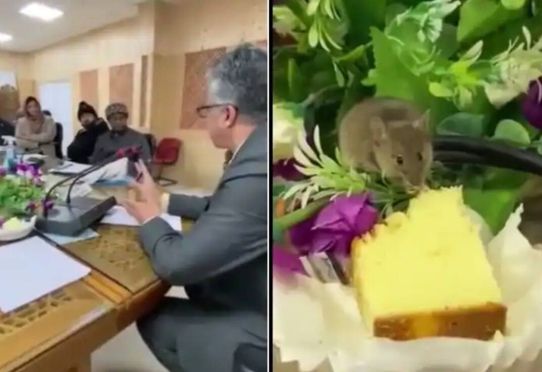 ਇਸ ਵਾਇਰਲ ਵੀਡੀਓ ਨੂੰ ਆਰਿਫ ਖਵਾਜਾ ਨਾਂ ਦੇ ਯੂਜ਼ਰ ਨੇ ਟਵਿਟਰ 'ਤੇ ਸ਼ੇਅਰ ਕੀਤਾ ਹੈ। ਜਾਣਕਾਰੀ ਮੁਤਾਬਕ ਆਰਿਫ ਖਵਾਜਾ ਜੰਮੂ-ਕਸ਼ਮੀਰ ਦੇ ਡੈਂਟਲ ਸਰਜਨ ਹਨ। ਸੋਸ਼ਲ ਮੀਡੀਆ 'ਤੇ ਸਾਹਮਣੇ ਆਈ ਇਕ ਕਲਿੱਪ ਵਿਚ ਚੂਹੇ ਇਕ ਮੀਟਿੰਗ ਦੌਰਾਨ ਉਨ੍ਹਾਂ ਦੇ ਸਾਹਮਣੇ ਪਲੇਟ ਵਿਚ ਰੱਖੇ ਕੇਕ ਦਾ ਟੁਕੜਾ ਖਾਂਦੇ ਦਿਖਾਈ ਦੇ ਰਹੇ ਹਨ। ਜਿਸ ਨੂੰ ਦੇਖ ਕੇ ਹਰ ਕੋਈ ਬਹੁਤ ਹੈਰਾਨ ਹੈ।