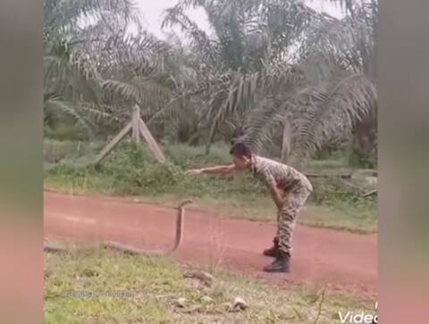 ਮਲੇਸ਼ੀਆ: ਆਮ ਤੌਰ 'ਤੇ ਲੋਕ ਸੱਪ-ਬਿੱਛੂ ਦਾ ਨਾਂ ਸੁਣਦਿਆਂ ਸਾਰ ਹੀ ਕੰਬ ਜਾਂਦੇ ਹਨ। ਕਈ ਵਾਰ ਕਮਜ਼ੋਰ ਦਿਲ ਵਾਲੇ ਲੋਕਾਂ ਨੂੰ ਤਾਂ ਦਿਲ ਦਾ ਦੌਰਾ ਵੀ ਪੈ ਜਾਂਦਾ ਹੈ ਪਰ ਦੱਖਣ ਪੂਰਬ ਏਸ਼ਿਆਈ ਦੇਸ਼ ਮਲੇਸ਼ੀਆ ਵਿੱਚ ਇੱਕ ਸਿਪਾਹੀ ਨੇ ਇਸ ਮਾਮਲੇ ਵਿੱਚ ਕਮਾਲ ਕਰ ਕੇ ਵਿਖਾਇਆ ਹੈ, ਜਿਸ ਨੂੰ ਵੇਖ ਕੇ ਤੁਹਾਨੂੰ ਹਿੰਮਤ ਜ਼ਰੂਰ ਮਿਲੇਗੀ। ਦਰਅਸਲ ਇਹ ਸੈਨਿਕ ਇੱਥੇ ਇੱਕ ਸੜਕ 'ਤੇ ਜਾ ਰਿਹਾ ਸੀ, ਉਸੇ ਸਮੇਂ ਇੱਕ ਕਿੰਗ ਕੋਬਰਾ ਸੜਕ 'ਤੇ ਉਸ ਸੈਨਿਕ ਦੀ ਕਮਰ ਤਕ ਖੜ੍ਹਾ ਦਿਖਾਈ ਦੇ ਰਿਹਾ ਹੈ। ਇੱਕ ਵਾਰ ਤਾਂ ਅਜਿਹਾ ਲੱਗਦਾ ਹੈ ਕਿ ਸਿਪਾਹੀ ਉੱਥੋਂ ਚਲਾ ਜਾਵੇਗਾ ਪਰ ਉਹ ਉੱਥੇ ਹੀ ਰੁਕ ਜਾਂਦਾ ਹੈ ਤੇ ਆਪਣੀ ਸਥਿਤੀ ਬਣਾਉਣ ਲੱਗ ਪੈਂਦਾ ਹੈ। ਕੋਬਰੇ ਨੂੰ ਵੇਖਣ ਤੋਂ ਬਾਅਦ, ਉਸ ਨੇ ਉਸ ਨੂੰ ਫੜਨ ਦਾ ਫੈਸਲਾ ਕੀਤਾ। ਹੌਲੀ ਹੌਲੀ, ਉਸ ਨੇ ਕੋਬਰੇ ਵੱਲ ਕਦਮ ਵਧਾਏ, ਕੋਬਰਾ ਸਿਪਾਹੀ ਦੀ ਕਮਰ ਤਕ ਆ ਰਿਹਾ ਸੀ, ਇਸ ਦੇ ਬਾਅਦ ਵੀ ਸਿਪਾਹੀ ਬਿਲਕੁਲ ਨਹੀਂ ਡਰਿਆ। ਉਸ ਨੇ ਫਿਲਮੀ ਸਟਾਈਲ ਵਿੱਚ ਪੋਜ਼ੀਸ਼ਨ ਬਣਾਈ ਤੇ ਫਿਰ ਕੋਬਰੇ ਵੱਲ ਵਧਿਆ। ਫਿਰ ਉਸ ਨੇ ਹੱਥ ਦੀਆਂ ਦੋ ਉਂਗਲੀਆਂ ਚੁੱਕੀਆਂ ਤੇ ਕੋਬਰੇ ਦੇ ਸਿਰ 'ਤੇ ਰੱਖੀਆਂ। ਫਿਰ ਉਸ ਨੂੰ ਹੌਲੀ-ਹੌਲੀ ਜ਼ਮੀਨ ਵੱਲ ਦਬਾ ਦਿੱਤਾ ਤੇ ਜਦੋਂ ਜ਼ਮੀਨ 'ਤੇ ਪਹੁੰਚਦਿਆਂ ਹੀ ਉਸ ਨੇ ਕੋਬਰੇ ਦਾ ਮੂੰਹ ਫੜ ਲਿਆ। ਇਸ ਪਿੱਛੋਂ ਕੋਬਰਾ ਸਿਪਾਹੀ ਦੇ ਹੱਥ 'ਤੇ ਲਪੇਟੇ ਮਾਰ ਗਿਆ। ਦੱਸ ਦੇਈਏ ਕਿੰਗ ਕੋਬਰਾ ਇੰਨਾ ਖ਼ਤਰਨਾਕ ਹੁੰਦਾ ਹੈ ਕਿ ਜੇ ਇਹ ਕਿਸੇ ਨੂੰ ਡੰਗ ਮਾਰ ਲਵੇ ਤਾਂ ਇਹ ਉਸ ਦੇ ਸਰੀਰ ਵਿੱਚ 1.7 ਮਿ.ਲੀ. ਦਾ ਜ਼ਹਿਰੀਲਾ ਟੀਕਾ ਲਾ ਦਿੰਦਾ ਹੈ। ਉਸ ਤੋਂ ਬਾਅਦ ਸਾਹਮਣੇ ਵਾਲੇ ਦਾ ਬਚਣਾ ਨਾਮੁਮਕਿਨ ਹੋ ਜਾਂਦਾ ਹੈ।