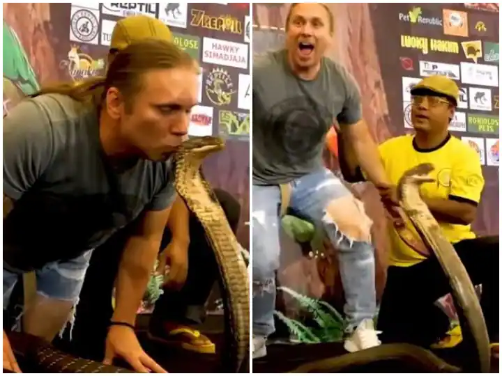 ਜ਼ਹਿਰੀਲੇ ਸੱਪ ਕਿਸੇ ਵੀ ਵਿਅਕਤੀ ਨੂੰ ਆਪਣੇ ਜ਼ਹਿਰ ਦੀ ਇੱਕ ਬੂੰਦ ਨਾਲ ਮਾਰਨ ਵਿੱਚ ਕੋਈ ਸਮਾਂ ਨਹੀਂ ਲਗਾਉਂਦੇ। ਅਜਿਹੇ 'ਚ ਕੋਈ ਵੀ ਸੱਪਾਂ ਦੇ ਨੇੜੇ ਨਹੀਂ ਜਾਣਾ ਚਾਹੁੰਦਾ। ਇਸ ਦੇ ਨਾਲ ਹੀ ਕਈ ਲੋਕ ਸਟੰਟ ਕਰਨ ਤੇ ਹੈਰਾਨੀਜਨਕ ਕਾਰਨਾਮੇ ਕਰਨ ਦੀ ਲਾਲਸਾ 'ਚ ਸੱਪਾਂ ਨਾਲ ਖੇਡਦੇ ਦੇਖੇ ਜਾਂਦੇ ਹਨ। ਹਾਲ ਹੀ ਵਿੱਚ ਸਾਹਮਣੇ ਆਈ ਇੱਕ ਵੀਡੀਓ ਵਿੱਚ ਇੱਕ ਵਿਅਕਤੀ ਭਿਆਨਕ ਜ਼ਹਿਰੀਲੇ ਕੋਬਰਾ ਸੱਪ ਨਾਲ ਹੈਰਾਨੀਜਨਕ ਕਾਰਨਾਮੇ ਕਰਦਾ ਦਿਖਾਈ ਦੇ ਰਿਹਾ ਹੈ। ਜ਼ਹਿਰੀਲੇ ਕਿੰਗ ਕੋਬਰਾ ਸੱਪ ਦੇ ਮੱਥੇ ਨੂੰ ਚੁੰਮਣ ਦੀ ਕੋਸ਼ਿਸ਼