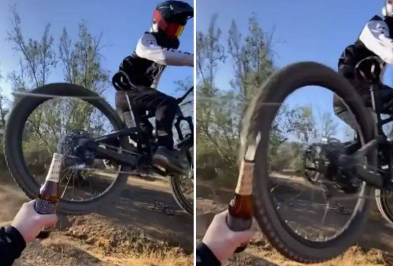 ਆਮ ਤੌਰ 'ਤੇ ਅਸੀਂ ਸਾਰਿਆਂ ਨੇ ਬੀਅਰ ਦੀਆਂ ਬੋਤਲਾਂ ਦਾ ਢੱਕਣ ਦੰਦਾਂ ਨਾਲ ਜਾਂ ਇਸ ਦੇ ਓਪਨਰ ਨਾਲ ਖੋਲ੍ਹਿਆ ਹੋਵੇਗਾ। ਇਸ ਸਮੇਂ ਵਾਇਰਲ ਹੋ ਰਹੀ ਕਲਿੱਪ ਵਿੱਚ ਇੱਕ ਵਿਅਕਤੀ ਬੀਅਰ ਦੀ ਬੋਤਲ ਫੜੀ ਨਜ਼ਰ ਆ ਰਿਹਾ ਹੈ। ਉਸੇ ਸਮੇਂ, ਸਾਹਮਣੇ ਤੋਂ ਇੱਕ ਪਹਾੜੀ ਬਾਈਕ ਤੇਜ਼ ਚਲਾ ਰਿਹਾ ਇੱਕ ਵਿਅਕਤੀ ਆਪਣੀ ਬਾਈਕ ਦੇ ਪਿਛਲੇ ਪਹੀਏ ਤੋਂ ਬੀਅਰ ਦੀ ਬੋਤਲ ਦੀ ਟੋਪੀ ਨੂੰ ਖੋਲ੍ਹਦਾ ਦਿਖਾਈ ਦਿੰਦਾ ਹੈ, ਹਵਾ ਵਿੱਚ ਉਛਾਲਦੇ ਹੋਏ ਵਿਅਕਤੀ ਦੇ ਹੱਥ ਦੇ ਨੇੜੇ ਪਹੁੰਚਦਾ ਹੈ।