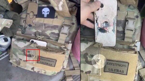 ਜੰਗ ਦੇ ਮੈਦਾਨ ਵਿੱਚ ਫ਼ੋਨ ਨੇ ਫ਼ੌਜੀ ਨੂੰ ਦਿੱਤੀ ਜੀਵਨਦਾਨ- ਇਸ ਕਹਾਣੀ ਦਾ ਵੀਡੀਓ ਅਤੇ ਕਿੱਸਾ ਸੋਸ਼ਲ ਮੀਡੀਆ ਪਲੇਟਫਾਰਮ Reddit 'ਤੇ ਸ਼ੇਅਰ ਕੀਤਾ ਗਿਆ ਹੈ। ਵਾਇਰਲ ਹੋ ਰਹੀ ਇਸ ਕਲਿੱਪ ਵਿੱਚ ਇੱਕ ਕਥਿਤ ਯੂਕਰੇਨੀਅਨ ਸਿਪਾਹੀ ਆਪਣੇ ਬੈਕਪੈਕ ਵਿੱਚੋਂ ਆਪਣਾ ਆਈਫੋਨ ਕੱਢਦਾ ਦਿਖਾਈ ਦੇ ਰਿਹਾ ਹੈ। ਵੀਡੀਓ ਵਿੱਚ, ਸਿਪਾਹੀ ਆਪਣੀ ਬੁਲੇਟ ਪਰੂਫ ਜੈਕੇਟ ਤੋਂ ਆਪਣੇ ਆਈਫੋਨ 11 ਪ੍ਰੋ ਨੂੰ ਹਟਾਉਂਦੇ ਹੋਏ ਦਿਖਾਈ ਦੇ ਰਿਹਾ ਹੈ, ਜਿਸ ਦੇ ਅੰਦਰ ਗੋਲੀ ਦਾ ਨਿਸ਼ਾਨ ਵੀ ਦਿਖਾਈ ਦਿੰਦਾ ਹੈ। ਇਸ 2019 ਮਾਡਲ ਆਈਫੋਨ ਨੇ ਬੁਲੇਟਪਰੂਫ ਜੈਕੇਟ ਦਾ ਕੰਮ ਕੀਤਾ, ਜਿਸ ਨੇ ਸਿਪਾਹੀ ਦੀ ਜਾਨ ਬਚਾਈ।