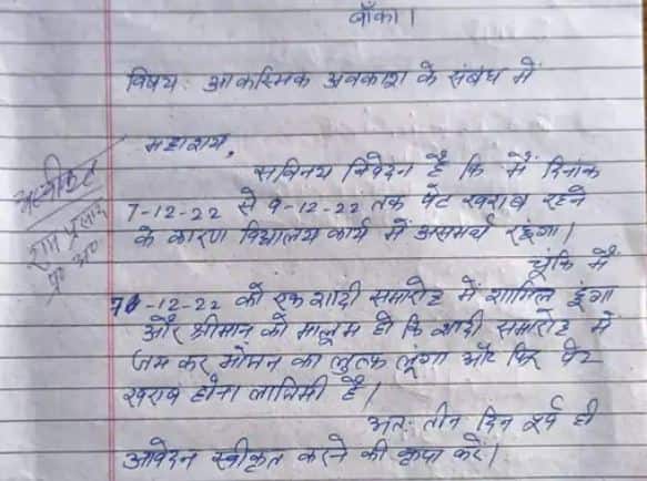 ਸੋਸ਼ਲ ਮੀਡੀਆ 'ਤੇ ਵਾਇਰਲ ਹੋ ਰਹੀ ਚਿੱਠੀ ਵਿੱਚ ਇਸ ਵਿਸ਼ੇ ਨੂੰ ਆਮ ਛੁੱਟੀ ਦੱਸਦਿਆਂ ਲਿਖਿਆ ਗਿਆ ਹੈ-ਸਰ, ਮੈਂ ਨਿਮਰਤਾ ਸਹਿਤ ਬੇਨਤੀ ਕਰਦਾ ਹਾਂ ਕਿ ਮੈਂ ਪੇਟ ਦੀ ਖਰਾਬੀ ਕਾਰਨ 7 ਦਸੰਬਰ ਤੋਂ 9 ਦਸੰਬਰ ਤੱਕ ਸਕੂਲ ਦਾ ਕੰਮ ਨਹੀਂ ਕਰ ਸਕਾਂਗਾ। ਕਿਉਂਕਿ ਮੈਂ 7 ਦਸੰਬਰ ਨੂੰ ਇੱਕ ਵਿਆਹ ਸਮਾਗਮ ਵਿੱਚ ਸ਼ਾਮਲ ਹੋਵਾਂਗਾ ਅਤੇ ਸ਼੍ਰੀਮਾਨ ਨੂੰ ਪਤਾ ਹੋਣਾ ਚਾਹੀਦਾ ਹੈ ਕਿ ਮੈਂ ਵਿਆਹ ਸਮਾਗਮ ਵਿੱਚ ਖਾਣੇ ਦਾ ਬਹੁਤ ਆਨੰਦ ਲਵਾਂਗਾ ਅਤੇ ਫਿਰ ਪੇਟ ਖਰਾਬ ਹੋਣਾ ਤੈਅ ਹੈ। ਇਸ ਲਈ ਕਿਰਪਾ ਕਰਕੇ 3 ਦਿਨ ਪਹਿਲਾਂ ਅਰਜ਼ੀ ਸਵੀਕਾਰ ਕਰੋ। ਇਹ ਪੱਤਰ ਅਧਿਆਪਕ ਨੀਰਜ ਕੁਮਾਰ ਨੇ ਲਿਖਿਆ ਹੈ।