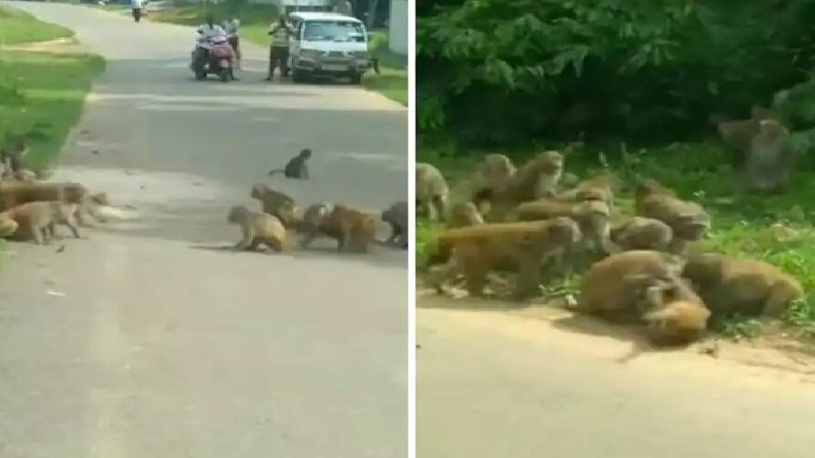 ਸੋਸ਼ਲ ਮੀਡੀਆ 'ਤੇ ਵਾਇਰਲ ਹੋ ਰਹੀ ਵੀਡੀਓ 'ਚ ਵੀ ਅਜਿਹਾ ਹੀ ਦੇਖਣ ਨੂੰ ਮਿਲ ਰਿਹਾ ਹੈ। ਵੀਡੀਓ 'ਚ ਬਾਂਦਰਾਂ ਦੇ ਦੋ ਗਰੁੱਪਾਂ ਵਿਚਾਲੇ ਖੂਨੀ ਗੈਂਗ ਵਾਰ ਹੁੰਦਾ ਨਜ਼ਰ ਆ ਰਿਹਾ ਹੈ। ਜਿਸ ਕਾਰਨ ਸੜਕ 'ਤੇ ਪੈਦਲ ਚੱਲਣ ਵਾਲੇ ਲੋਕ ਵੀ ਇਨ੍ਹਾਂ ਤੋਂ ਦੂਰ ਖੜ੍ਹੇ ਨਜ਼ਰ ਆ ਰਹੇ ਹਨ। ਇਸ ਦੌਰਾਨ ਦੋ ਗਰੁੱਪਾਂ ਦੇ ਬਾਂਦਰ ਇੱਕ ਦੂਜੇ ਨੂੰ ਲਲਕਾਰਦੇ ਅਤੇ ਅੱਖਾਂ ਦਿਖਾਉਂਦੇ ਨਜ਼ਰ ਆ ਰਹੇ ਹਨ।