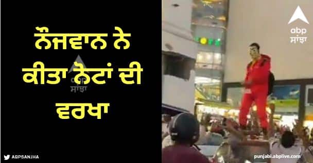 ਵਾਇਰਲ ਹੋ ਰਿਹਾ ਵੀਡੀਓ ਜੈਪੁਰ ਦੇ ਇੱਕ ਸ਼ਾਪਿੰਗ ਕੰਪਲੈਕਸ ਦਾ ਹੈ, ਜਿੱਥੇ ਸੜਕ 'ਤੇ ਕਾਫੀ ਭੀੜ ਹੈ। ਮਾਲ ਦੇ ਬਿਲਕੁਲ ਬਾਹਰ ਇੱਕ ਨੌਜਵਾਨ ਕਾਰ ਦੀ ਛੱਤ 'ਤੇ ਖੜ੍ਹਾ ਦਿਖਾਈ ਦੇ ਰਿਹਾ ਹੈ। ਜਿਸ ਨੇ ਨੈੱਟਫਲਿਕਸ 'ਤੇ ਮਸ਼ਹੂਰ ਸੀਰੀਜ਼ ਮਨੀ ਹੇਸਟ ਦੇ ਕਿਰਦਾਰਾਂ ਵਾਂਗ ਲਾਲ ਕੱਪੜੇ ਪਾਏ ਹੋਏ ਹਨ। ਇਸ ਤੋਂ ਇਲਾਵਾ, ਮਾਸਕ ਵੀ ਉਸੇ ਸਟਾਈਲ ਵਿੱਚ ਪਹਿਨਿਆ ਹੋਇਆ ਹੈ।