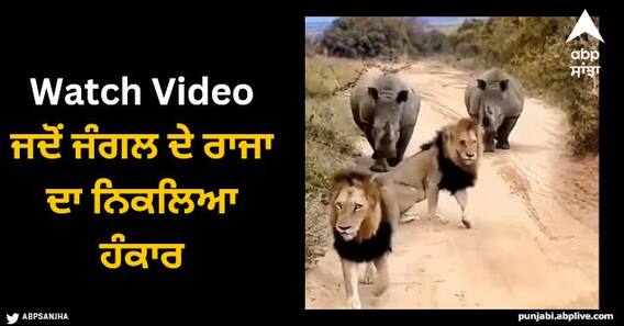 ਜੰਗਲ ਦਾ ਇਹ ਵੀਡੀਓ ਟਵਿੱਟਰ 'ਤੇ ਨੇਚਰ ਇਜ਼ ਅਮੇਜ਼ਿੰਗ ਨਾਂ ਦੇ ਪੇਜ 'ਤੇ ਸ਼ੇਅਰ ਕੀਤਾ ਗਿਆ ਹੈ। ਇਸ ਵੀਡੀਓ 'ਚ ਤੁਸੀਂ ਦੇਖ ਸਕਦੇ ਹੋ ਕਿ ਦੋ ਸ਼ੇਰ ਫੁੱਟਪਾਥ 'ਤੇ ਆਰਾਮ ਨਾਲ ਆਰਾਮ ਕਰਦੇ ਨਜ਼ਰ ਆ ਰਹੇ ਹਨ। ਇਸ ਦੌਰਾਨ ਪਿੱਛੇ ਤੋਂ ਦੋ ਗੈਂਡੇ ਪੈਦਲ ਆ ਰਹੇ ਹਨ। ਵੀਡੀਓ ਨੂੰ ਦੇਖ ਕੇ ਤਾਂ ਇਹ ਬਿਲਕੁਲ ਵੀ ਨਹੀਂ ਲੱਗਦਾ ਕਿ ਇਹ ਗੈਂਡੇ ਸ਼ੇਰ 'ਤੇ ਹਮਲਾ ਕਰਨ ਜਾ ਰਹੇ ਹਨ ਪਰ ਜਿਵੇਂ ਹੀ ਇਨ੍ਹਾਂ ਦੋਵਾਂ ਸ਼ੇਰਾਂ ਨੇ ਪਿੱਛੇ ਮੁੜ ਕੇ ਗੈਂਡੇ ਨੂੰ ਦੇਖਿਆ ਤਾਂ ਸ਼ੇਰ ਦਾ ਸਾਰਾ ਹੰਕਾਰ ਦੂਰ ਹੋ ਗਿਆ ਅਤੇ ਉਹ ਉਥੋਂ ਭੱਜ ਗਿਆ।