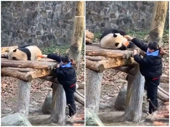 ਵਾਇਰਲ ਵੀਡੀਓ 'ਚ ਚਿੜੀਆਘਰ ਦੇ ਅੰਦਰ ਕੰਮ ਕਰਨ ਵਾਲਾ ਇਕ ਲੜਕੀ ਨਜ਼ਰ ਆ ਰਹੀ ਹੈ, ਜੋ ਸੁੱਤੇ ਪਏ ਪਾਂਡੇ ਦੇ ਘੇਰੇ 'ਚ ਜਾਂਦੀ ਹੈ ਅਤੇ ਉਸ ਨੂੰ ਜਗਾਉਂਦੀ ਹੈ ਅਤੇ ਉਸ ਨੂੰ ਖਾਣ ਲਈ ਕੁਝ ਦਿੰਦੀ ਹੈ, ਜਿਸ 'ਤੇ ਪਾਂਡਾ ਉੱਠਦੇ ਹੀ ਖਾਣ-ਪੀਣ ਦੀਆਂ ਚੀਜ਼ਾਂ ਨੂੰ ਹੱਥਾਂ 'ਚ ਫੜਾ ਦਿੰਦਾ ਹੈ ਅਤੇ ਉਹ ਮਜ਼ਾ ਲੈਣ ਲੱਗ ਪੈਂਦਾ ਹੈ।