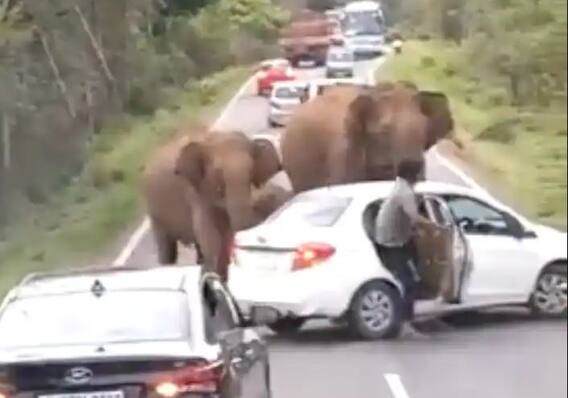 Elephant Video: ਇਨ੍ਹੀਂ ਦਿਨੀਂ ਸੋਸ਼ਲ ਮੀਡੀਆ (Social Media) 'ਤੇ ਹਾਥੀਆਂ (Elephants) ਦੇ ਇੱਕ ਸਮੂਹ ਦਾ ਇੱਕ ਵੀਡੀਓ ਤੇਜ਼ੀ ਨਾਲ ਵਾਇਰਲ ਹੋ ਰਿਹਾ ਹੈ। ਇਸ ਵੀਡੀਓ ਨੂੰ ਦੇਖ ਕੇ ਇੰਟਰਨੈੱਟ 'ਤੇ ਲੋਕਾਂ 'ਚ ਦਹਿਸ਼ਤ ਫੈਲ ਗਈ ਹੈ। ਵੀਡੀਓ ਹੈਰਾਨ ਕਰਨ ਦੇ ਨਾਲ-ਨਾਲ ਡਰਾਉਣ ਵਾਲੀ ਵੀ ਹੈ। ਹਾਥੀਆਂ ਦਾ ਅਜਿਹਾ ਹੀ ਇੱਕ ਵੀਡੀਓ ਸੋਸ਼ਲ ਮੀਡੀਆ ਰਾਹੀਂ ਸਾਹਮਣੇ ਆਇਆ ਹੈ। ਵੀਡੀਓ 'ਚ ਕੁਝ ਹਾਥੀ ਕਾਫੀ ਗੁੱਸੇ 'ਚ ਨਜ਼ਰ ਆ ਰਹੇ ਹਨ ਅਤੇ ਸੜਕ ਦੇ ਵਿਚਕਾਰ ਇੱਕ ਕਾਰ ਚਾਲਕ 'ਤੇ ਹਮਲਾ ਕਰ ਦਿੰਦੇ ਹਨ।