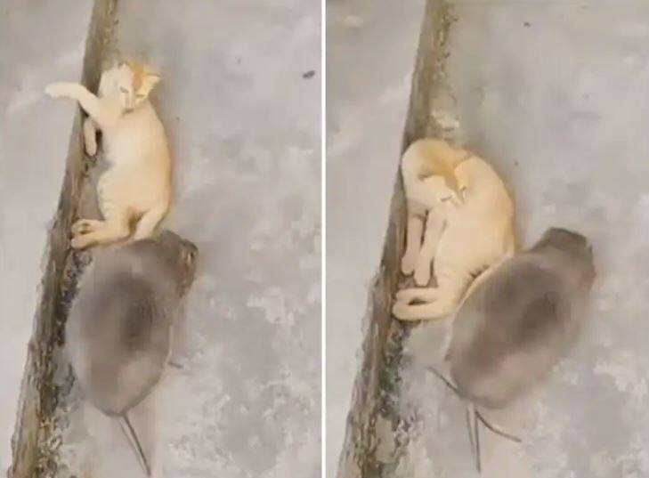 ਵਾਇਰਲ ਹੋ ਰਹੇ ਵੀਡੀਓ 'ਚ ਬਿੱਲੀ 'ਤੇ ਹਮਲਾ ਕਰਨ ਦੀ ਬਜਾਏ ਚੂਹੇ ਨੂੰ ਦੇਖ ਕੇ ਹੈਰਾਨ ਹੁੰਦੀ ਨਜ਼ਰ ਆ ਰਹੀ ਹੈ। ਵੀਡੀਓ 'ਚ ਦੇਖਿਆ ਜਾ ਸਕਦਾ ਹੈ ਕਿ ਘਰ 'ਚ ਇਕ ਬਿੱਲੀ ਜ਼ਮੀਨ 'ਤੇ ਸੌਂ ਰਹੀ ਹੈ, ਜਦੋਂ ਇਕ ਵਿਸ਼ਾਲ ਚੂਹਾ ਸੁੰਘਦਾ ਹੋਇਆ ਉਸ ਦੇ ਨੇੜੇ ਪਹੁੰਚਦਾ ਹੈ। ਚੂਹਾ ਕਾਫੀ ਦੇਰ ਤੱਕ ਬਿੱਲੀ ਦੇ ਕੋਲ ਖੜ੍ਹਾ ਰਹਿੰਦਾ ਹੈ, ਇਸ ਦੌਰਾਨ ਬਿੱਲੀ ਉਸ 'ਤੇ ਬਿਲਕੁਲ ਵੀ ਹਮਲਾ ਨਹੀਂ ਕਰਦੀ ਅਤੇ ਨਾ ਹੀ ਚੂਹਾ ਉਥੋਂ ਭੱਜਣ ਦੀ ਕੋਸ਼ਿਸ਼ ਕਰਦਾ ਹੈ। ਅੰਤ ਵਿੱਚ, ਚੂਹਾ ਅੱਗੇ ਵਧਦਾ ਹੈ, ਜਦੋਂ ਕਿ ਬਿੱਲੀ ਹੈਰਾਨੀ ਨਾਲ ਚੂਹੇ ਨੂੰ ਦੇਖਦੀ ਰਹਿੰਦੀ ਹੈ। ਫਿਲਹਾਲ ਇਹ ਵੀਡੀਓ ਸੋਸ਼ਲ ਮੀਡੀਆ 'ਤੇ ਤੇਜ਼ੀ ਨਾਲ ਵਾਇਰਲ ਹੋ ਰਿਹਾ ਹੈ, ਜਿਸ ਨੂੰ ਦੇਖ ਕੇ ਯੂਜ਼ਰਸ ਹੈਰਾਨ ਰਹਿ ਗਏ ਹਨ।