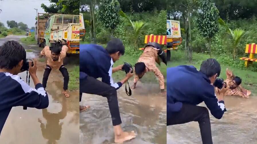 ਇਸ ਦੌਰਾਨ ਇਕ ਨੌਜਵਾਨ ਗੰਦੇ ਪਾਣੀ 'ਚ ਵੱਖ-ਵੱਖ ਪੋਜ਼ 'ਚ ਫੋਟੋਸ਼ੂਟ ਕਰਦਾ ਨਜ਼ਰ ਆ ਰਿਹਾ ਹੈ। ਇਸ ਦੌਰਾਨ ਵਿਅਕਤੀ ਪਾਣੀ 'ਤੇ ਜ਼ੋਰ ਨਾਲ ਛਾਲ ਮਾਰਦਾ ਅਤੇ ਫਿਰ ਉਸ 'ਚ ਲੇਟ ਕੇ ਪੋਜ਼ ਦਿੰਦਾ ਨਜ਼ਰ ਆਉਂਦਾ ਹੈ। ਇਸ ਤੋਂ ਬਾਅਦ ਵੀ ਵਿਅਕਤੀ ਨਹੀਂ ਰੁਕਦਾ ਅਤੇ ਹੱਥਾਂ 'ਤੇ ਖੜ੍ਹੇ ਹੋ ਕੇ ਸਟੰਟ ਕਰਦੇ ਹੋਏ ਫੋਟੋਸ਼ੂਟ ਕਰਵਾ ਲੈਂਦਾ ਹੈ। ਇਹ ਮਜ਼ਾਕੀਆ ਵੀਡੀਓ ਸੋਸ਼ਲ ਮੀਡੀਆ 'ਤੇ ਕਾਫੀ ਦੇਖਿਆ ਜਾ ਰਿਹਾ ਹੈ।