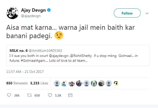 ਗੋਲਮਾਲ ਅਗੇਨ' ਬਾਰੇ ਟਵਿੱਟਰ 'ਤੇ ਸਵਾਲਾਂ ਦਾ ਹੜ੍ਹ, ਅਜੇ ਦੇਵਗਨ ਨੇ ਦਿੱਤੇ ਮਜ਼ੇਦਾਰ ਜਵਾਬ, ਪੜ੍ਹੋ