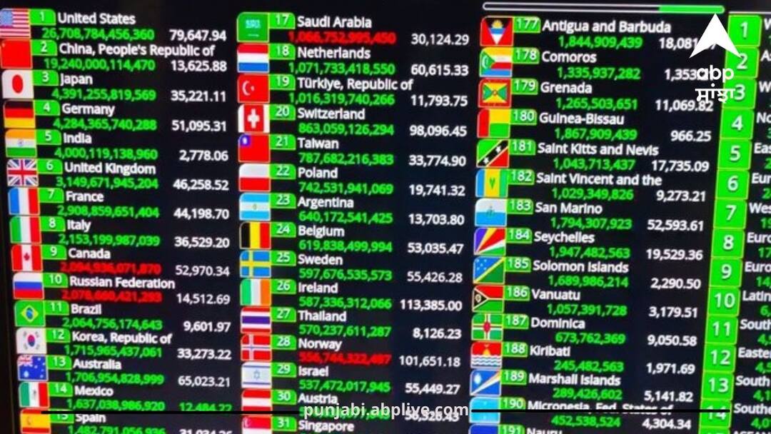 ਅਮਰੀਕਾ 26,708,784,456,360 ਡਾਲਰ ਦੇ ਨਾਲ ਜੀਡੀਪੀ ਦੇ ਮਾਮਲੇ ਵਿੱਚ ਪਹਿਲੇ ਸਥਾਨ 'ਤੇ ਬਣਿਆ ਹੋਇਆ ਹੈ। ਚੀਨ 19,240,000,114,470 ਡਾਲਰ ਨਾਲ ਦੂਜੇ ਸਥਾਨ 'ਤੇ, ਜਾਪਾਨ 4,391,255,819,569 ਡਾਲਰ ਨਾਲ ਤੀਜੇ ਸਥਾਨ 'ਤੇ ਅਤੇ ਜਰਮਨੀ 4,284,365,740,288 ਡਾਲਰ ਨਾਲ ਚੌਥੇ ਸਥਾਨ 'ਤੇ ਹੈ।