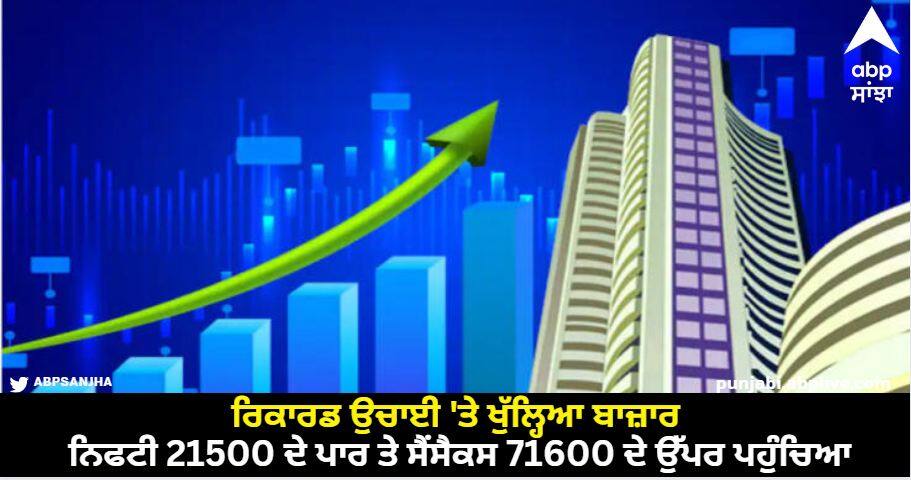 ਅੱਜ ਫਿਰ ਤੋਂ ਬਾਜ਼ਾਰ ਦੀ ਸ਼ੁਰੂਆਤ ਰਿਕਾਰਡ ਉਚਾਈ 'ਤੇ ਦੇਖਣ ਨੂੰ ਮਿਲੀ ਹੈ। BSE ਸੈਂਸੈਕਸ 210.47 ਅੰਕ ਜਾਂ 0.29 ਫੀਸਦੀ ਦੇ ਵਾਧੇ ਨਾਲ 71,647 'ਤੇ ਖੁੱਲ੍ਹਿਆ ਅਤੇ ਇਹ ਇਸ ਦਾ ਨਵਾਂ ਰਿਕਾਰਡ ਉੱਚ ਪੱਧਰ ਹੈ। NSE ਦਾ ਨਿਫਟੀ 90.40 ਅੰਕ ਜਾਂ 0.42 ਫੀਸਦੀ ਦੀ ਮਜ਼ਬੂਤੀ ਨਾਲ 21,543 ਦੇ ਪੱਧਰ 'ਤੇ ਖੁੱਲ੍ਹਿਆ।