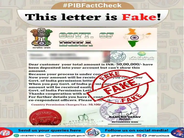 PIB Fact Check on Viral Message: ਦੇਸ਼ ਵਿੱਚ ਜਿਵੇਂ-ਜਿਵੇਂ ਡਿਜੀਟਲਾਈਜ਼ੇਸ਼ਨ (Digitalisation) ਦਾ ਦਾਇਰਾ ਵਧਿਆ ਹੈ, ਸਾਈਬਰ ਧੋਖਾਧੜੀ ਦੇ ਮਾਮਲੇ ਵੀ ਤੇਜ਼ੀ ਨਾਲ ਵਧੇ ਹਨ। ਅੱਜ ਕੱਲ੍ਹ ਸਾਈਬਰ ਅਪਰਾਧੀ (Cyber Criminals) ਲੋਕਾਂ ਨੂੰ ਆਪਣੇ ਜਾਲ ਵਿੱਚ ਫਸਾਉਣ ਲਈ ਨਵੇਂ-ਨਵੇਂ ਹੱਥਕੰਡੇ ਅਪਣਾ ਰਹੇ ਹਨ। ਅੱਜਕੱਲ੍ਹ ਸੋਸ਼ਲ ਮੀਡੀਆ 'ਤੇ ਇੱਕ ਮੈਸੇਜ ਬਹੁਤ ਵਾਇਰਲ ਹੋ ਰਿਹਾ ਹੈ, ਜਿਸ ਵਿੱਚ ਦਾਅਵਾ ਕੀਤਾ ਜਾ ਰਿਹਾ ਹੈ ਕਿ ਸਰਕਾਰ ਲੋਕਾਂ ਦੇ ਖੇਤਿਆਂ ਵਿੱਚ 30 ਲੱਖ ਰੁਪਏ ਟਰਾਂਸਫਰ ਕਰਨ ਜਾ ਰਹੀ ਹੈ। ਇਹ ਪੈਸਾ ਸਰਕਾਰੀ ਸਕੀਮ ਵਾਂਗ ਲੋਕਾਂ ਦੇ ਖਾਤਿਆਂ ਵਿੱਚ ਟਰਾਂਸਫਰ ਕੀਤਾ ਜਾਵੇਗਾ। ਇਹ ਮੈਸੇਜ਼ ਹੋ ਰਿਹਾ ਵਾਇਰਲਤੁਹਾਨੂੰ ਦੱਸ ਦੇਈਏ ਕਿ ਵਾਇਰਲ ਮੈਸੇਜ ਵਿੱਚ ਕਿਹਾ ਜਾ ਰਿਹਾ ਹੈ ਕਿ ਇੱਕ ਸਰਕਾਰੀ ਸਕੀਮ ਰਾਹੀਂ ਸਰਕਾਰ ਲੋਕਾਂ ਦੇ ਖਾਤਿਆਂ ਵਿੱਚ 30 ਲੱਖ ਰੁਪਏ ਟਰਾਂਸਫਰ ਕਰਨ ਜਾ ਰਹੀ ਹੈ। ਇਸ ਵਾਇਰਲ ਮੈਸੇਜ ਵਿੱਚ ਇੱਕ ਪੱਤਰ ਪ੍ਰਸਾਰਿਤ ਕੀਤਾ ਜਾ ਰਿਹਾ ਹੈ, ਜਿਸ ਵਿੱਚ ਦਾਅਵਾ ਕੀਤਾ ਜਾ ਰਿਹਾ ਹੈ ਕਿ ਇਹ ਰਕਮ ਅਜੇ ਤੁਹਾਡੇ ਖਾਤੇ ਵਿੱਚ ਦਿਖਾਈ ਨਹੀਂ ਦੇ ਰਹੀ ਹੈ। ਇਸ ਪੈਸੇ ਨੂੰ ਆਪਣੇ ਖਾਤੇ ਵਿੱਚ ਟ੍ਰਾਂਸਫਰ ਕਰਨ ਲਈ ਤੁਹਾਨੂੰ 10,100 ਦੀ ਫੀਸ ਅਦਾ ਕਰਨੀ ਪਵੇਗੀ।