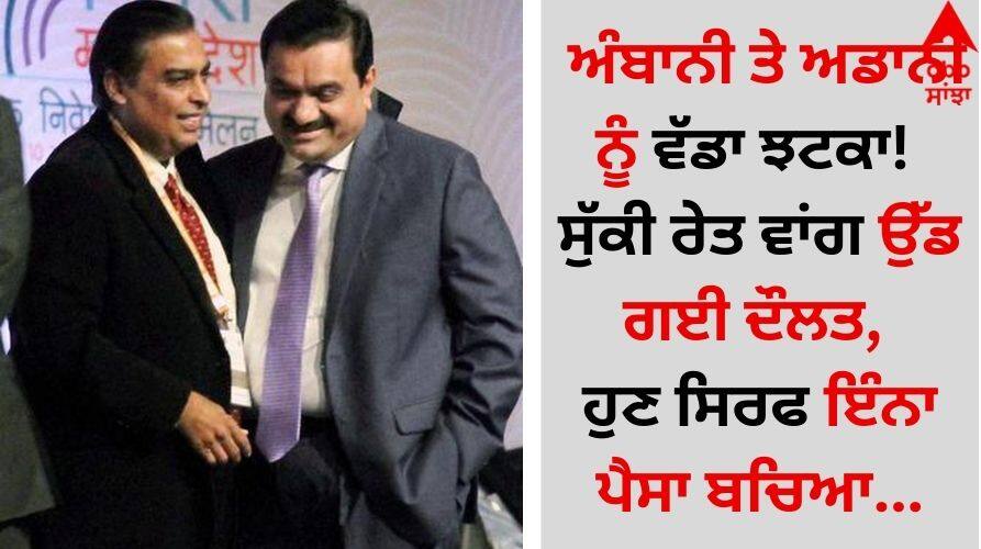 Ambani Adani Net Worth: ਅੰਬਾਨੀ ਤੇ ਅਡਾਨੀ ਨੂੰ ਵੱਡਾ ਝਟਕਾ ਲੱਗਾ ਹੈ। ਉਨ੍ਹਾਂ ਦੀ ਦੌਲਤ 100 ਅਰਬ ਡਾਲਰ ਤੋਂ ਹੇਠਾਂ ਖਿਸਕ ਗਈ ਹੈ। ਦੇਸ਼ ਦੇ ਦੋ ਸਭ ਤੋਂ ਅਮੀਰ ਉਦਯੋਗਪਤੀਆਂ ਮੁਕੇਸ਼ ਅੰਬਾਨੀ ਤੇ ਗੌਤਮ ਅਡਾਨੀ ਦੀ ਦੌਲਤ 'ਚ ਪਿਛਲੇ ਕੁਝ ਮਹੀਨਿਆਂ 'ਚ ਭਾਰੀ ਗਿਰਾਵਟ ਦੇਖਣ ਨੂੰ ਮਿਲੀ ਹੈ। ਬਲੂਮਬਰਗ ਦੀ ਰਿਪੋਰਟ ਮੁਤਾਬਕ ਮੁਕੇਸ਼ ਅੰਬਾਨੀ ਤੇ ਗੌਤਮ ਅਡਾਨੀ ਦੀ ਜਾਇਦਾਦ ਹਾਲ ਦੇ ਮਹੀਨਿਆਂ 'ਚ 100 ਅਰਬ ਡਾਲਰ ਤੋਂ ਹੇਠਾਂ ਆ ਗਈ ਹੈ।