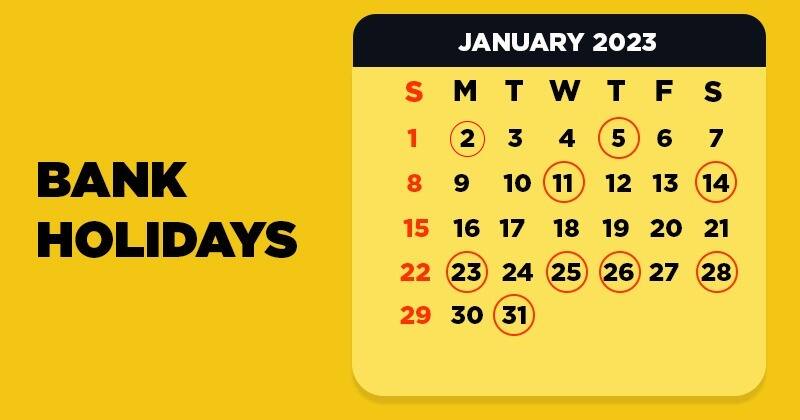 13 ਜਨਵਰੀ, 2024- ਦੂਜਾ ਸ਼ਨੀਵਾਰ14 ਜਨਵਰੀ, 2024- ਐਤਵਾਰ15 ਜਨਵਰੀ, 2024- ਪੋਂਗਲ/ਤਿਰੂਵੱਲੂਵਰ ਦਿਵਸ/ਮਕਰ ਸੰਕ੍ਰਾਂਤੀ/ਮਾਘ ਬਿਹੂ ਕਾਰਨ ਪੰਜਾਬ, ਬੈਂਗਲੁਰੂ, ਚੇਨਈ, ਗੰਗਟੋਕ, ਗੁਹਾਟੀ ਅਤੇ ਹੈਦਰਾਬਾਦ ਵਿੱਚ ਬੈਂਕ ਬੰਦ ਰਹਿਣ ਜਾ ਰਹੇ ਹਨ।16 ਜਨਵਰੀ, 2024- ਤਿਰੂਵੱਲੂਵਰ ਦਿਵਸ ਕਾਰਨ ਚੇਨਈ ਵਿੱਚ ਬੈਂਕਾਂ ਵਿੱਚ ਛੁੱਟੀ ਰਹੇਗੀ।17 ਜਨਵਰੀ, 2024- ਉਝਵਰ ਥਿਰੁਨਾਲ ਕਾਰਨ ਚੇਨਈ ਵਿੱਚ ਬੈਂਕ ਬੰਦ ਰਹਿਣਗੇ।21 ਜਨਵਰੀ, 2024- ਐਤਵਾਰ22 ਜਨਵਰੀ, 2024- ਇਮੋਇਨੂ ਇਰਾਪਟਾ ਕਾਰਨ ਇੰਫਾਲ ਵਿੱਚ ਬੈਂਕਾਂ ਵਿੱਚ ਛੁੱਟੀ ਰਹੇਗੀ।23 ਜਨਵਰੀ, 2024- ਇੰਫਾਲ ਵਿੱਚ ਗਾਉਣ ਅਤੇ ਨੱਚਣ ਕਾਰਨ ਬੈਂਕ ਛੁੱਟੀ ਰਹੇਗੀ।25 ਜਨਵਰੀ, 2024- ਥਾਈ ਪੋਸ਼ਮ/ਹਜ਼ਰਤ ਮੁਹੰਮਦ ਅਲੀ ਦੇ ਜਨਮ ਦਿਨ ਕਾਰਨ ਚੇਨਈ, ਕਾਨਪੁਰ ਅਤੇ ਲਖਨਊ ਵਿੱਚ ਬੈਂਕਾਂ ਵਿੱਚ ਛੁੱਟੀ ਰਹੇਗੀ।26 ਜਨਵਰੀ, 2024- ਗਣਤੰਤਰ ਦਿਵਸ ਕਾਰਨ ਦੇਸ਼ ਭਰ ਵਿੱਚ ਬੈਂਕ ਬੰਦ ਰਹਿਣਗੇ।27 ਜਨਵਰੀ, 2024- ਚੌਥਾ ਸ਼ਨੀਵਾਰ28 ਜਨਵਰੀ, 2024- ਐਤਵਾਰ