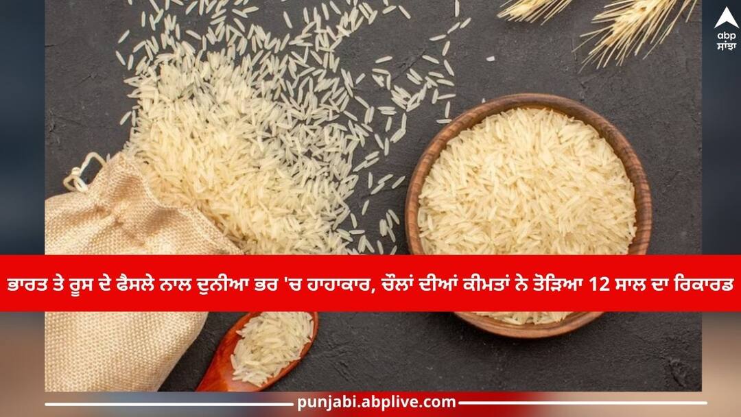 Rice Price: ਭਾਰਤ ਤੇ ਰੂਸ ਦੇ ਇੱਕ ਫੈਸਲੇ ਨੇ ਪੂਰੀ ਦੁਨੀਆ ਵਿੱਚ ਖਲਬਲੀ ਮਚਾ ਦਿੱਤੀ ਹੈ। ਸੰਯੁਕਤ ਰਾਸ਼ਟਰ ਫੂਡ ਐਂਡ ਐਗਰੀਕਲਚਰ ਆਰਗੇਨਾਈਜ਼ੇਸ਼ਨ (FAO) ਅਨੁਸਾਰ, ਚੌਲਾਂ ਤੇ ਬਨਸਪਤੀ ਤੇਲ ਵਰਗੀਆਂ ਖੁਰਾਕੀ ਵਸਤਾਂ ਦੀਆਂ ਕੀਮਤਾਂ ਇਨ੍ਹਾਂ ਮਹੀਨਿਆਂ ਵਿੱਚ ਪਹਿਲੀ ਵਾਰ ਇੰਨੀਆਂ ਜ਼ਿਆਦਾ ਵਧੀਆਂ ਹਨ। ਇੰਨਾ ਹੀ ਨਹੀਂ ਚੌਲਾਂ ਦੀਆਂ ਕੀਮਤਾਂ 12 ਸਾਲਾਂ ਦੇ ਰਿਕਾਰਡ ਪੱਧਰ 'ਤੇ ਪਹੁੰਚ ਗਈਆਂ ਹਨ।