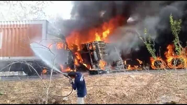ਮੌਕੇ 'ਤੇ ਮੌਜੂਦ ਕੁਝ ਲੋਕਾਂ ਨੇ ਦੱਸਿਆ ਕਿ ਦੋ ਟਰੱਕਾਂ ਦੀ ਆਹਮੋ-ਸਾਹਮਣੇ ਟੱਕਰ ਹੋ ਗਈ ਅਤੇ ਇਕ ਕਾਰ ਵੀ ਇਨ੍ਹਾਂ ਦੀ ਲਪੇਟ 'ਚ ਆ ਗਈ। ਇੱਕ ਟਰੱਕ ਕੈਮੀਕਲ ਨਾਲ ਭਰਿਆ ਹੋਇਆ ਸੀ, ਜਿਸ ਕਾਰਨ ਤਿੰਨੋਂ ਗੱਡੀਆਂ ਨੂੰ ਅੱਗ ਲੱਗ ਗਈ। ਅੱਗ ਇੰਨੀ ਤੇਜ਼ੀ ਨਾਲ ਫੈਲ ਗਈ ਕਿ ਕਿਸੇ ਨੂੰ ਵੀ ਠੀਕ ਹੋਣ ਦਾ ਮੌਕਾ ਨਹੀਂ ਮਿਲਿਆ। ਫਾਇਰ ਬ੍ਰਿਗੇਡ ਨੇ ਮੌਕੇ 'ਤੇ ਪਹੁੰਚ ਕੇ ਅੱਗ ਬੁਝਾਉਣ ਦੀ ਕੋਸ਼ਿਸ਼ ਕੀਤੀ ਪਰ ਉਦੋਂ ਤੱਕ 6 ਲੋਕਾਂ ਦੀ ਮੌਤ ਹੋ ਚੁੱਕੀ ਸੀ। ਹਾਈਵੇਅ ’ਤੇ ਲੱਗਿਆ 10 ਕਿਲੋਮੀਟਰ ਲੰਬਾ ਜਾਮ