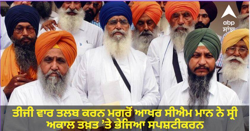 Amritsar News: ਗੁਰਬਾਣੀ ਸੋਧ ਬਿੱਲ ਰਾਹੀਂ ਸਿੱਖ ਧਰਮ ਵਿੱਚ ਦਖ਼ਲਅੰਦਾਜ਼ੀ ਦੇ ਮਾਮਲੇ ਸਬੰਧੀ ਮੁੱਖ ਮੰਤਰੀ ਭਗਵੰਤ ਮਾਨ ਨੇ ਆਪਣੇ ਦੋ ਨੁਮਾਇੰਦਿਆਂ ਦੇ ਰਾਹੀਂ ਆਪਣਾ ਸਪਸ਼ਟੀਕਰਨ ਮੁਤਵਾਜ਼ੀ ਜਥੇਦਾਰ ਭਾਈ ਧਿਆਨ ਸਿੰਘ ਮੰਡ ਨੂੰ ਭੇਜਿਆ ਹੈ। ਭਗਵੰਤ ਮਾਨ ਨੂੰ ਸਪਸ਼ਟੀਕਰਨ ਦੇਣ ਵਾਸਤੇ ਮੁਤਵਾਜ਼ੀ ਜਥੇਦਾਰ ਵੱਲੋਂ ਤੀਜੀ ਵਾਰ ਸ੍ਰੀ ਅਕਾਲ ਤਖ਼ਤ ’ਤੇ ਸੱਦਿਆ ਗਿਆ ਸੀ ਤੇ ਬੁੱਧਵਾਰ ਨੂੰ ਸਪਸ਼ਟੀਕਰਨ ਦੇਣ ਦਾ ਆਖਰੀ ਮੌਕਾ ਸੀ।