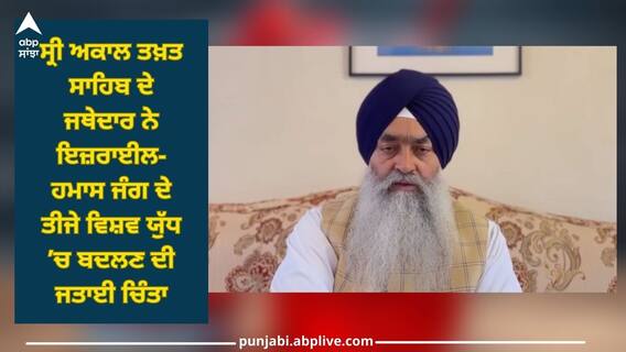 Punjab News: ਇਜ਼ਰਾਈਲ-ਹਮਾਸ ਵਿਚਕਾਰ ਚੱਲ ਰਹੇ ਯੁੱਧ ਨੇ ਹਰ ਕਿਸੇ ਨੂੰ ਚਿੰਤਾ ਵਿੱਚ ਪਾਇਆ ਹੋਇਆ ਹੈ। ਜਿਸਦੇ ਚੱਲਦੇ ਅੰਮ੍ਰਿਤਸਰ ਤੋਂ ਜਥੇਦਾਰ ਗਿਆਨੀ ਰਘਬੀਰ ਸਿੰਘ ਨੇ ਇਸ ਮੁਸ਼ਕਿਲ ਸਮੇਂ ਵਿੱਚ ਲੋਕਾਂ ਨੂੰ ਵਿਸ਼ਵ ਸ਼ਾਂਤੀ ਦੀ ਅਰਦਾਸ ਕਰਨ ਦੀ ਗੱਲ ਆਖੀ ਹੈ। ਸ੍ਰੀ ਅਕਾਲ ਤਖ਼ਤ ਸਾਹਿਬ ਦੇ ਜਥੇਦਾਰ ਗਿਆਨੀ ਰਘਬੀਰ ਸਿੰਘ (Giani Raghbir Singh) ਨੇ ਇਜ਼ਰਾਈਲ-ਹਮਾਸ ਵਿਚਕਾਰ ਛਿੜੇ ਯੁੱਧ ਨੂੰ ਮਨੁੱਖਤਾ ਲਈ ਘੋਰ ਦੁਖਾਂਤਕ ਕਰਾਰ ਦਿੰਦਿਆਂ ਚਿੰਤਾ ਜਤਾਈ ਹੈ ਕਿ ਜੇਕਰ ਇਸ ਦੁਵੱਲੀ ਜੰਗ ਨੂੰ ਤੁਰੰਤ ਨਾ ਰੋਕਿਆ ਗਿਆ ਤਾਂ ਹਾਲਾਤ ਤੀਜੀ ਵਿਸ਼ਵ ਜੰਗ ਵੱਲ ਵੱਧ ਸਕਦੇ ਹਨ, ਜੋ ਮਨੁੱਖੀ ਸੱਭਿਅਤਾ ਲਈ ਮਾਰੂ ਸਾਬਤ ਹੋ ਸਕਦੀ ਹੈ।