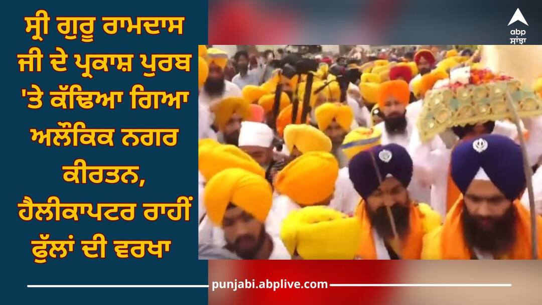 Amritsar news: ਸਿੱਖਾਂ ਦੇ ਚੌਥੇ ਗੁਰੂ ਸ੍ਰੀ ਗੁਰੂ ਰਾਮਦਾਸ ਜੀ ਦੇ ਪ੍ਰਕਾਸ਼ ਪੁਰਬ ਦੇ ਸਬੰਧ ਵਿੱਚ ਇੱਕ ਵਿਸ਼ਾਲ ਅਲੌਕਿਕ ਨਗਰ ਕੀਰਤਨ ਸ੍ਰੀ ਅਕਾਲ ਤਖ਼ਤ ਸਾਹਿਬ ਤੋਂ ਪੰਜ ਪਿਆਰਿਆਂ ਦੀ ਅਗਵਾਈ ਵਿੱਚ ਕੱਢਿਆ ਗਿਆ। ਇਹ ਨਗਰ ਕੀਰਤਨ ਗੁਰੂ ਨਗਰੀ ਅੰਮ੍ਰਿਤਸਰ ਦੀ ਚਾਰਦੀਵਾਰੀ ਤੋਂ ਹੁੰਦਾ ਹੋਇਆ ਵਾਪਸ ਸ੍ਰੀ ਹਰਿਮੰਦਰ ਸਾਹਿਬ ਵਿੱਚ ਆ ਕੇ ਸੰਪੰਨ ਹੋਏਗਾ ਰਸਤੇ ਵਿੱਚ ਨਗਰ ਕੀਰਤਨ ਨੂੰ ਸਮੂਹ ਸੰਗਤਾਂ ਦੇ ਵਿਸ਼ਾਲ ਨੇ ਸਵਾਗਤ ਕੀਤਾ ਤੇ ਹੈਲੀਕਾਪਟਰ ਰਾਹੀਂ ਫੁੱਲਾਂ ਦੀ ਵਰਖਾ ਵੀ ਕੀਤੀ।