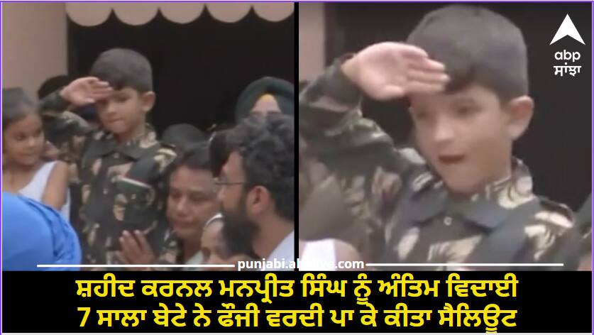 Chandigarh News: 13 ਸਤੰਬਰ ਬੁੱਧਵਾਰ ਨੂੰ ਅਨੰਤਨਾਗ 'ਚ ਅੱਤਵਾਦੀਆਂ ਨਾਲ ਮੁਕਾਬਲੇ 'ਚ ਸ਼ਹੀਦ ਹੋਏ ਨਿਊ ਚੰਡੀਗੜ੍ਹ ਦੇ ਕਰਨਲ ਮਨਪ੍ਰੀਤ ਸਿੰਘ ਨੂੰ ਅੱਜ ਅੰਤਿਮ ਵਿਦਾਈ ਦਿੱਤੀ ਗਈ। ਇਸ ਦੌਰਾਨ 7 ਸਾਲ ਦੇ ਬੇਟੇ ਕਬੀਰ ਨੇ ਫੌਜੀ ਵਰਦੀ ਪਾ ਕੇ ਆਪਣੇ ਪਿਤਾ ਨੂੰ ਸੈਲਿਊਟ ਕੀਤਾ। ਜਦੋਂਕਿ ਪਤਨੀ ਸ਼ਹੀਦ ਦੇ ਤਾਬੂਤ 'ਤੇ ਸਿਰ ਰੱਖ ਕੇ ਰੋਂਦੀ ਰਹੀ। ਕਰਨਲ ਦੀ ਅੰਤਿਮ ਯਾਤਰਾ ਚੰਡੀ ਮੰਦਰ ਆਰਮੀ ਕੈਂਟ ਤੋਂ ਚੰਡੀਗੜ੍ਹ ਰਾਹੀਂ ਨਿਊ ਚੰਡੀਗੜ੍ਹ ਤੱਕ ਪਹੁੰਚੀ।