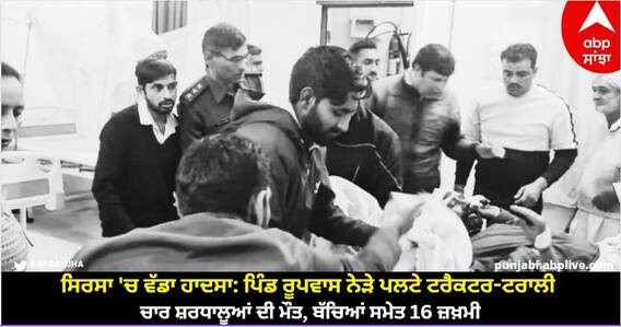 Chandigarh News : ਪੰਜਾਬ ਦੇ ਸ਼ਹਿਰ ਪਾਤੜਾ ਮੰਡੀ ਤੋਂ ਗੋਗਾਮੇੜੀ ਨੂੰ ਜਾ ਰਹੀ ਸ਼ਰਧਾਲੂਆਂ ਦੀ ਟਰਾਲੀ ਵੀਰਵਾਰ ਰਾਤ ਪਿੰਡ ਰੂਪਵਾਸ ਨੇੜੇ ਚੋਪਟਾ ਨੌਹਰ ਰੋਡ 'ਤੇ ਟਰੈਕਟਰ ਦੀ ਹੁੱਕ ਟੁੱਟਣ ਕਾਰਨ ਪਲਟ ਗਈ। ਟਰਾਲੀ ਹੇਠਾਂ ਔਰਤਾਂ ਤੇ ਬੱਚਿਆਂ ਸਣੇ ਕਈ ਲੋਕ ਦੱਬ ਗਏ। ਦੋ ਵਿਅਕਤੀਆਂ ਅਤੇ ਦੋ ਬੱਚਿਆਂ ਦੀ ਮੌਕੇ ’ਤੇ ਹੀ ਮੌਤ ਹੋ ਗਈ ਜਦਕਿ ਔਰਤਾਂ ਤੇ ਬੱਚਿਆਂ ਸਣੇ 16 ਲੋਕ ਜ਼ਖ਼ਮੀ ਹੋ ਗਏ।