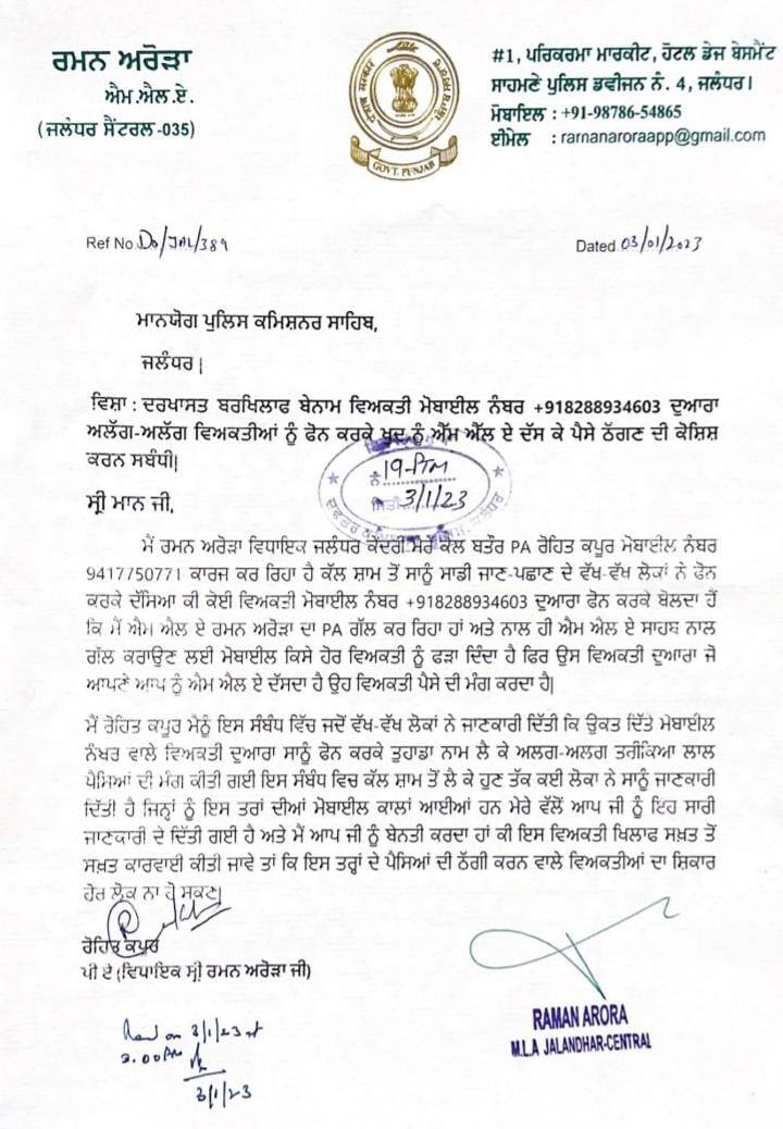 Jalandhar News: ਜਲੰਧਰ 'ਚ ਕੁਝ ਲੋਕਾਂ ਨੂੰ ਫ਼ੋਨ ਆਇਆ ਜਿਸ 'ਤੇ ਫ਼ੋਨ ਕਰਨ ਵਾਲੇ ਨੇ ਆਪਣੀ ਜਾਣ-ਪਛਾਣ ਵਿਧਾਇਕ ਰਮਨ ਅਰੋੜਾ (ਪੀ.ਏ.) ਦੇ ਤੌਰ 'ਤੇ ਕਰਵਾਈ ਅਤੇ ਇਸ ਦੇ ਨਾਲ ਹੀ ਵਿਧਾਇਕ ਰਮਨ ਅਰੋੜਾ ਨਾਲ ਗੱਲ ਕਰਨ ਲਈ ਫ਼ੋਨ ਕਿਸੇ ਹੋਰ ਵਿਅਕਤੀ ਨੂੰ ਦੇ ਦਿੱਤਾ। ਦੂਜੇ ਵਿਅਕਤੀ ਨੇ ਸਾਹਮਣੇ ਵਾਲੇ ਵਿਅਕਤੀ ਤੋਂ ਪੈਸੇ ਦੀ ਮੰਗ ਕੀਤੀ, ਜਿਸ ਦੇ ਪਿੱਛੇ ਵੱਖ-ਵੱਖ ਕਾਰਨ ਦੱਸੇ ਗਏ।