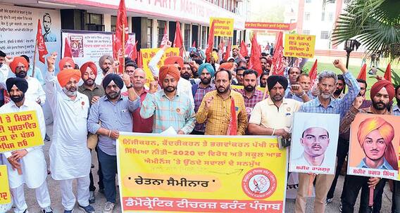 Jalandhar News: ਡੈਮੋਕ੍ਰੈਟਿਕ ਟੀਚਰਜ਼ ਫ਼ਰੰਟ (ਡੀਟੀਐਫ) ਪੰਜਾਬ ਵੱਲੋਂ ਕੇਂਦਰ ਸਰਕਾਰ ਦੀ ਨਵੀਂ ਸਿੱਖਿਆ ਨੀਤੀ-2020 ਦਾ ਵਿਰੋਧ ਤੇ ਪੰਜਾਬ ਸਰਕਾਰ ਦੀ ‘ਸਕੂਲ ਆਫ਼ ਐਮੀਨੈਂਸ’ ਸਕੀਮ ’ਤੇ ਸਵਾਲ ਚੁੱਕਣ ਲਈ ਸੂਬਾ ਪ੍ਰਧਾਨ ਵਿਕਰਮ ਦੇਵ ਸਿੰਘ ਤੇ ਜਨਰਲ ਸਕੱਤਰ ਮੁਕੇਸ਼ ਕੁਮਾਰ ਦੀ ਅਗਵਾਈ ਵਿੱਚ ਦੇਸ਼ ਭਗਤ ਯਾਦਗਾਰ ਹਾਲ ’ਚ ਸੂਬਾ ਪੱਧਰੀ ਚੇਤਨਾ ਸੈਮੀਨਾਰ ਕੀਤਾ ਗਿਆ। ਸੈਮੀਨਾਰ ਉਪਰੰਤ ਪ੍ਰੈੱਸ ਕਲੱਬ ਚੌਕ ਤੱਕ ਰੋਸ ਮਾਰਚ ਕਰਦਿਆਂ ਪ੍ਰਸ਼ਾਸਨ ਰਾਹੀਂ ਮੁੱਖ ਮੰਤਰੀ ਨੂੰ ਸਵਾਲ ਪੱਤਰ ਭੇਜਿਆ।