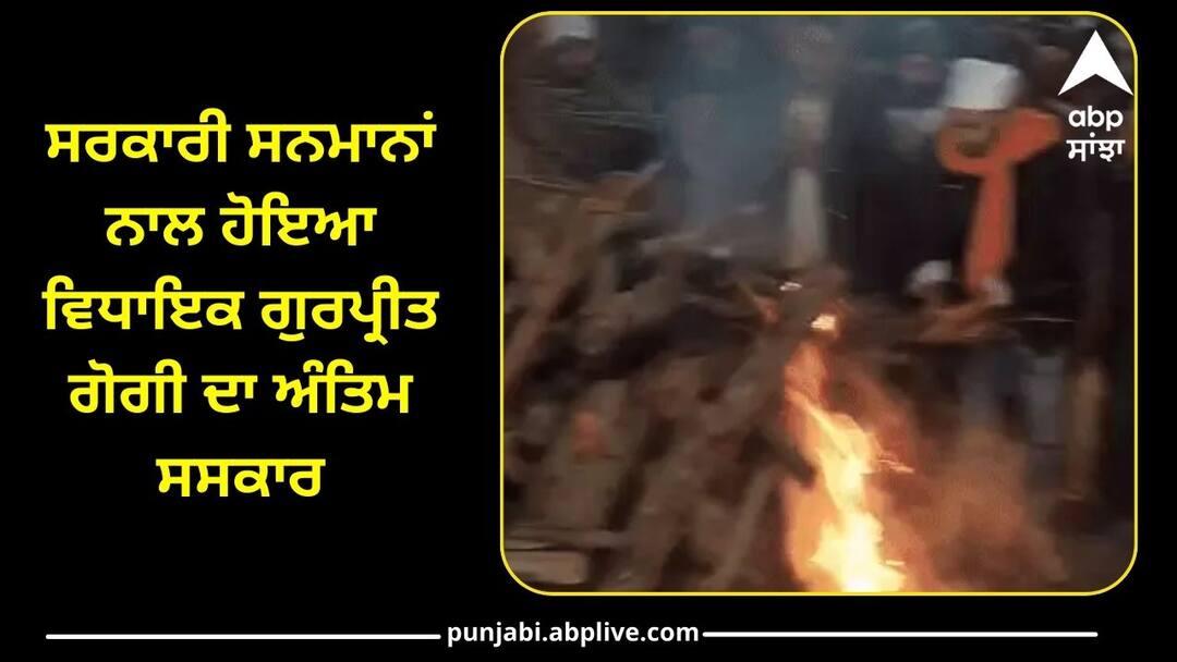 Ludhiana News: ਲੁਧਿਆਣਾ ਪੱਛਮੀ ਵਿਧਾਨ ਸਭਾ ਸੀਟ ਤੋਂ ਆਮ ਆਦਮੀ ਪਾਰਟੀ (AAP) ਦੇ ਵਿਧਾਇਕ ਗੁਰਪ੍ਰੀਤ ਸਿੰਘ ਗੋਗੀ ਦਾ ਸ਼ਨੀਵਾਰ (11 ਜਨਵਰੀ) ਨੂੰ ਸਰਕਾਰੀ ਸਨਮਾਨਾਂ ਨਾਲ ਅੰਤਿਮ ਸੰਸਕਾਰ ਕਰ ਦਿੱਤਾ ਗਿਆ। ਉਨ੍ਹਾਂ ਦੇ ਪੁੱਤਰ ਵਿਸ਼ਵਾਸ ਬੱਸੀ ਨੇ ਚਿਖਾ ਨੂੰ ਅਗਨੀ ਦਿੱਤੀ। ਮੁੱਖ ਮੰਤਰੀ ਭਗਵੰਤ ਮਾਨ ਸਮੇਤ ਸੂਬੇ ਭਰ ਤੋਂ ਵੱਖ-ਵੱਖ ਪਾਰਟੀਆਂ ਦੇ ਆਗੂ ਉਨ੍ਹਾਂ ਨੂੰ ਸ਼ਰਧਾਂਜਲੀ ਦੇਣ ਲਈ ਕੇਵੀਐਮ ਸਕੂਲ ਨੇੜੇ ਸ਼ਮਸ਼ਾਨਘਾਟ ਪਹੁੰਚੇ।