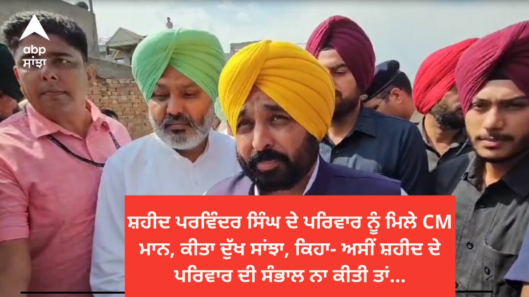 Sangrur news: ਮੁੱਖ ਮੰਤਰੀ ਭਗਵੰਤ ਮਾਨ ਅਤੇ ਕੈਬਨਿਟ ਮੰਤਰੀ ਹਰਪਾਲ ਸਿੰਘ ਚੀਮਾ ਨੇ ਸੰਗਰੂਰ ਦੇ ਝਾਜਲੀ ਪਿੰਡ ਦੇ ਸ਼ਹੀਦ ਪਰਵਿੰਦਰ ਸਿੰਘ ਦੇ ਨਾਲ ਮੁਲਾਕਾਤ ਕੀਤੀ। ਇਸ ਦੌਰਾਨ ਉਨ੍ਹਾਂ ਨੇ ਪਰਿਵਾਰ ਨਾਲ ਦੁੱਖ ਸਾਂਝਾ ਕੀਤਾ ਅਤੇ ਪਰਿਵਾਰ ਨੂੰ 1 ਕਰੋੜ ਰੁਪਏ ਦਾ ਚੈੱਕ ਸੌਂਪਿਆ।