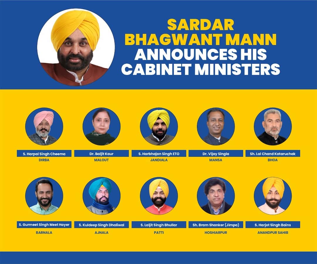 ਰਵਨੀਤ ਕੌਰ ਦੀ ਰਿਪੋਰਟਚੰਡੀਗੜ੍ਹ : ਪੰਜਾਬ 'ਚ ਆਮ ਆਦਮੀ ਪਾਰਟੀ (AAP Party) ਦੀ ਸਰਕਾਰ ਬਣਨ ਤੋਂ ਬਾਅਦ ਹੁਣ ਸੰਵਿਧਾਨਕ ਅਹੁਦਿਆਂ 'ਤੇ ਨਿਯੁਕਤੀਆਂ ਦੀ ਪ੍ਰਕਿਰਿਆ ਚੱਲ ਰਹੀ ਹੈ। ਪੰਜਾਬ 'ਚ ਕੱਲ੍ਹ 10 ਕੈਬਨਿਟ ਮੰਤਰੀ ਸਹੁੰ ਚੁੱਕਣਗੇ ਤੇ ਉਨ੍ਹਾਂ ਦੇ ਨਾਵਾਂ 'ਤੇ ਭਗਵੰਤ ਮਾਨ ਨੇ ਮੋਹਰ ਲਾ ਦਿੱਤੀ ਹੈ। ਹਰਪਾਲ ਸਿੰਘ ਚੀਮਾ, ਡਾ: ਬਲਜੀਤ ਕੌਰ, ਹਰਭਜਨ ਸਿੰਘ ਈਟੀਓ, ਡਾ. ਵਿਜੇ ਸਿੰਗਲਾ, ਗੁਰਮੀਤ ਸਿੰਘ ਮੀਤ ਹੇਅਰ, ਹਰਜੋਤ ਸਿੰਘ ਬੈਂਸ, ਲਾਲ ਚੰਦ ਕਟਾਰੂਚੱਕ, ਕੁਲਦੀਪ ਸਿੰਘ ਧਾਲੀਵਾਲ, ਲਾਲਜੀਤ ਸਿੰਘ ਭੁੱਲਰ, ਬ੍ਰਹਮ ਸ਼ੰਕਰ (ਜ਼ਿੰਪਾ) ਵੀ ਮੰਤਰੀ ਵਜੋਂ ਸਹੁੰ ਚੁੱਕਣਗੇ। ਕੱਲ੍ਹ ਸਵੇਰੇ 11 ਵਜੇ ਸਹੁੰ ਚੁੱਕ ਸਮਾਗਮ ਹੋਵੇਗਾ।