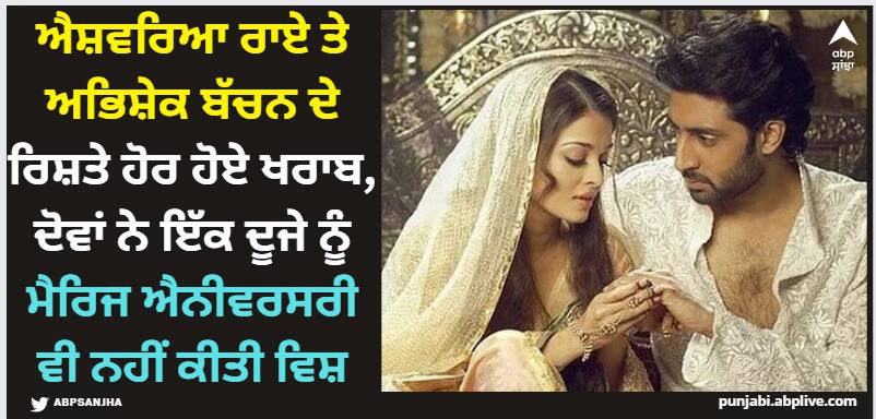 ਇੱਕ ਦੂਜੇ ਨੂੰ ਮੈਰਿਜ ਐਨੀਵਰਸਰੀ ਦੀ ਨਹੀਂ ਦਿੱਤੀ ਵਧਾਈਐਸ਼ਵਰਿਆ ਤੇ ਅਭਿਸ਼ੇਕ ਦੋਵੇਂ ਸੋਸ਼ਲ ਮੀਡੀਆ 'ਤੇ ਕਾਫੀ ਐਕਟਿਵ ਰਹਿੰਦੇ ਹਨ। ਇੱਥੋਂ ਤੱਕ ਕਿ ਅਭਿਸ਼ੇਕ ਆਪਣੇ ਪਰਿਵਾਰ ਦੇ ਹਰ ਜੀਅ ਦੇ ਜਨਮਦਿਨ ਜਾਂ ਐਨੀਵਰਸਰੀ ਤੇ ਉਨ੍ਹਾਂ ਨੂੰ ਵਧਾਈ ਦਿੰਦਾ ਹੈ ਅਤੇ ਸੋਸ਼ਲ ਮੀਡੀਆ 'ਤੇ ਸਪੈਸ਼ਲ ਪੋਸਟਾਂ ਵੀ ਸ਼ੇਅਰ ਕਰਦਾ ਹੈ। ਮਾਂ ਜਯਾ ਬੱਚਨ ਦੇ ਜਨਮਦਿਨ ਯਾਨਿ 9 ਅਪ੍ਰੈਲ ਨੂੰ ਵੀ ਅਭਿਸ਼ੇਕ ਪੋਸਟ ਪਾ ਕੇ ਮਾਂ ਨੂੰ ਜਨਮਦਿਨ ਦੀ ਵਧਾਈ ਦਿੱਤੀ। ਪਰ ਆਪਣੀ ਮੈਰਿਜ ਐਨੀਵਰਸਰੀ 'ਤੇ ਇੱਕ ਪੋੋਸਟ ਤੱਕ ਸ਼ੇਅਰ ਨਹੀਂ ਕੀਤੀ। ਦੂਜੇ ਪਾਸੇ, ਐਸ਼ ਨੇ ਵੀ ਸੋਸ਼ਲ ਮੀਡੀਆ 'ਤੇ ਅੱਜ ਦੇ ਦਿਨ ਚੁੱਪੀ ਸਾਧੀ ਹੋਈ ਹੈ।