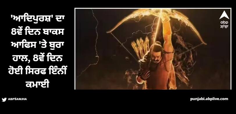 Adipurush Box Office Collection Day 8: ਪ੍ਰਭਾਸ ਅਤੇ ਕ੍ਰਿਤੀ ਸੈਨਨ ਦੀ 'ਆਦਿਪੁਰਸ਼' ਨੇ ਕਈ ਵਿਵਾਦਾਂ ਅਤੇ ਪਾਬੰਦੀ ਦੀ ਮੰਗ ਦੇ ਵਿਚਕਾਰ ਸਿਨੇਮਾਘਰਾਂ ਵਿੱਚ ਸਫਲਤਾਪੂਰਵਕ ਇੱਕ ਹਫ਼ਤਾ ਪੂਰਾ ਕਰ ਲਿਆ ਹੈ। ਨਕਾਰਾਤਮਕ ਸਮੀਖਿਆਵਾਂ ਦੇ ਬਾਵਜੂਦ, ਓਮ ਰਾਉਤ ਦੇ ਨਿਰਦੇਸ਼ਨ ਹੇਠ ਬਣੀ ਇਸ ਫਿਲਮ ਨੇ ਦੁਨੀਆ ਭਰ ਦੇ ਬਾਕਸ ਆਫਿਸ 'ਤੇ 400 ਕਰੋੜ ਰੁਪਏ ਤੋਂ ਵੱਧ ਦੀ ਕਮਾਈ ਕੀਤੀ ਹੈ। ਹਾਲਾਂਕਿ ਭਾਰਤ ਵਿੱਚ ਮਿਥਿਹਾਸਕ ਫਿਲਮ ਦੀ ਕਮਾਈ ਸ਼ੁਰੂਆਤੀ ਵੀਕੈਂਡ ਤੋਂ ਹਰ ਦਿਨ ਘੱਟ ਰਹੀ ਹੈ। ਆਓ ਜਾਣਦੇ ਹਾਂ 'ਆਦਿਪੁਰਸ਼' ਨੇ ਰਿਲੀਜ਼ ਦੇ ਦੂਜੇ ਸ਼ੁੱਕਰਵਾਰ ਯਾਨੀ 8ਵੇਂ ਦਿਨ ਕਿੰਨਾ ਕਾਰੋਬਾਰ ਕੀਤਾ ਹੈ।