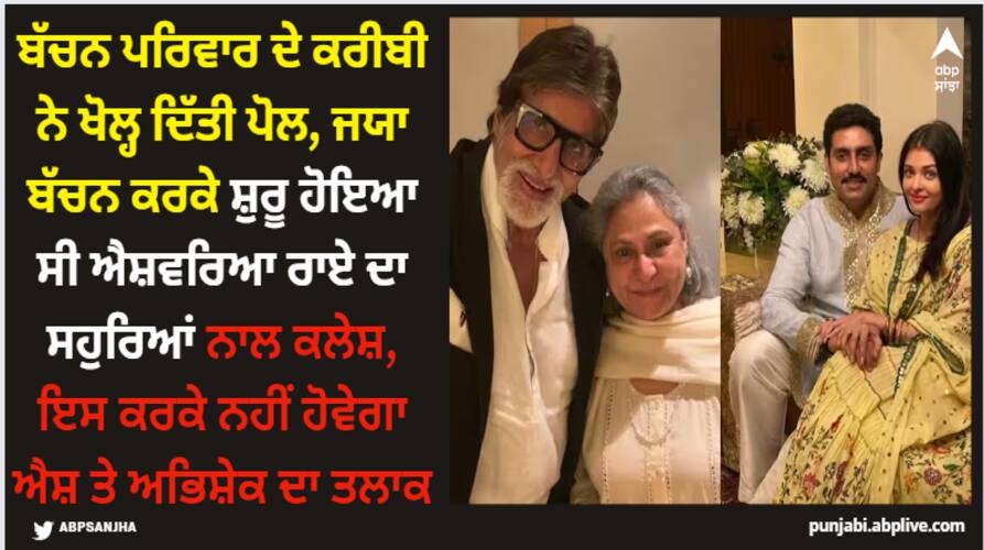 Aishwarya Rai Abhishek Bachchan Divorce: ਬਾਲੀਵੁੱਡ ਦੀ ਸਭ ਤੋਂ ਟੈਲੇਂਟਡ ਤੇ ਖੂਬਸੂਰਤ ਅਭਿਨੇਤਰੀ ਐਸ਼ਵਰਿਆ ਰਾਏ ਇੰਨੀਂ ਦਿਨੀਂ ਖੂਬ ਸੁਰਖੀਆਂ ;ਚ ਬਣੀ ਹੋਈ ਹੈ। ਦਰਅਸਲ, ਐਸ਼ਵਰਿਆ ਦਾ ਆਪਣੇ ਸਹੁਰੇ ਪਰਿਵਾਰ ਤੇ ਪਤੀ ਨਾਲ ਝਗੜਾ ਚੱਲ ਰਿਹਾ ਹੈ। ਕਿਹਾ ਜਾ ਰਿਹਾ ਹੈ ਕਿ ਜਦੋਂ ਤੋਂ ਅਮਿਤਾਭ ਦੀ ਧੀ ਸ਼ਵੇਤਾ ਆਪਣਾ ਘਰ ਛੱਡ ਆਪਣੇ ਮਾਪਿਆਂ ਯਾਨਿ ਅਮਿਤਾਭ ਤੇ ਜਯਾ ਕੋਲ ਰਹਿਣ ਆਈ ਹੈ, ਉਦੋਂ ਤੋਂ ਹੀ ਐਸ਼ ਦੇ ਆਪਣੇ ਸਹੁਰੇ ਪਰਿਵਾਰ ਨਾਲ ਰਿਸ਼ਤੇ ਹੋਰ ਵਿਗੜ ਗਏ ਹਨ।