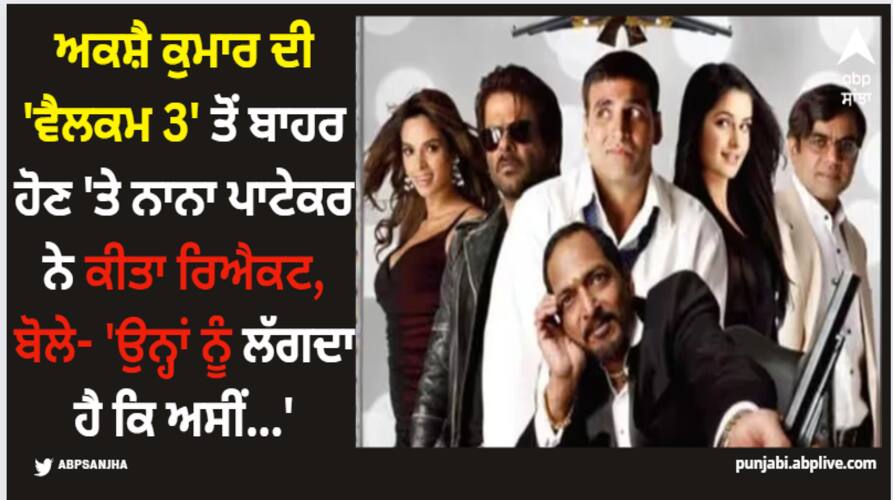 ਨਾਨਾ ਪਾਟੇਕਰ ਨੇ ਵੈਲਕਮ 3 ਦਾ ਹਿੱਸਾ ਨਾ ਬਣਨ 'ਤੇ ਕਹੀ ਇਹ ਗੱਲਹੁਣ ਜਦੋਂ ਨਾਨਾ ਪਾਟੇਕਰ ਤੋਂ ਪੁੱਛਿਆ ਗਿਆ ਕਿ ਉਹ ਫਿਲਮ ਦਾ ਹਿੱਸਾ ਕਿਉਂ ਨਹੀਂ ਹਨ? ਇਸ 'ਤੇ ਉਨ੍ਹਾਂ ਕਿਹਾ, 'ਉਨ੍ਹਾਂ ਨੂੰ ਲੱਗਦਾ ਹੈ ਕਿ ਅਸੀਂ ਬੁੱਢੇ ਹੋ ਗਏ ਹਾਂ। ਸ਼ਾਇਦ ਇਸੇ ਲਈ ਮੈਨੂੰ ਫਿਲਮ 'ਚ ਨਹੀਂ ਲਿਆ। ਦੂਜੇ ਪਾਸੇ, ਹੋਰ ਵੀ ਫਿਲਮ ਮੇਕਰਸ ਹਨ, ਜਿਨ੍ਹਾਂ ਨੂੰ ਲੱਗਦਾ ਹੈ ਕਿ ਮੈਂ ਬੁੱਢਾ ਨਹੀਂ ਹੋਇਆ ਹਾਂ (ਵੈਕਸੀਨ ਵਾਰ ਦੇ ਨਿਰਦੇਸ਼ਕ ਵਿਵੇਕ ਅਗਨੀਹੋਤਰੀ ਵੱਲ ਇਸ਼ਾਰਾ ਕਰਦੇ ਹੋਏ) ਇਸ ਲਈ ਉਨ੍ਹਾਂ ਨੇ ਮੈਨੂੰ ਆਪਣੀ ਫਿਲਮ 'ਚ ਲੈ ਲਿਆ।