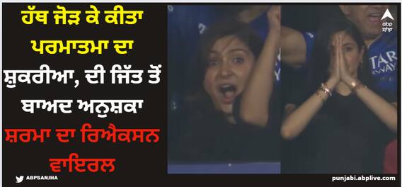 Anushka Sharma Reaction On RCB Win: ਰਾਇਲ ਚੈਲੇਂਜਰ ਬੈਂਗਲੁਰੂ (RCB) ਨੇ IPL 2024 ਦੇ 62ਵੇਂ ਮੈਚ ਵਿੱਚ ਦਿੱਲੀ ਕੈਪੀਟਲਸ ਨੂੰ 47 ਦੌੜਾਂ ਨਾਲ ਹਰਾਇਆ। ਸੀਜ਼ਨ ਵਿੱਚ ਇਹ ਆਰਸੀਬੀ ਦੀ ਲਗਾਤਾਰ ਪੰਜਵੀਂ ਜਿੱਤ ਸੀ। ਇਸ ਜਿੱਤ ਤੋਂ ਬਾਅਦ ਵਿਰਾਟ ਕੋਹਲੀ ਦੀ ਪਤਨੀ ਅਤੇ ਬਾਲੀਵੁੱਡ ਅਦਾਕਾਰਾ ਅਨੁਸ਼ਕਾ ਸ਼ਰਮਾ ਨੇ ਸੁੱਖ ਦਾ ਸਾਹ ਲਿਆ ਅਤੇ ਹੱਥ ਜੋੜ ਕੇ ਪ੍ਰਮਾਤਮਾ ਦਾ ਧੰਨਵਾਦ ਕੀਤਾ। ਅਨੁਸ਼ਕਾ ਸ਼ਰਮਾ ਦੀ ਇਹ ਪ੍ਰਤੀਕਿਰਿਆ ਸੋਸ਼ਲ ਮੀਡੀਆ 'ਤੇ ਤੇਜ਼ੀ ਨਾਲ ਵਾਇਰਲ ਹੋ ਰਹੀ ਹੈ।