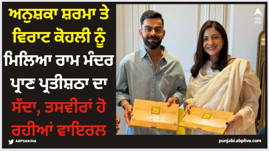 Anushka-Virat Got Ram Mandir Inauguration Invitation: ਹੁਣ ਅਦਾਕਾਰਾ ਅਨੁਸ਼ਕਾ ਸ਼ਰਮਾ ਦਾ ਨਾਂ ਵੀ ਉਨ੍ਹਾਂ ਸਿਤਾਰਿਆਂ ਦੀ ਸੂਚੀ ਵਿੱਚ ਜੁੜ ਗਿਆ ਹੈ, ਜਿਨ੍ਹਾਂ ਨੂੰ ਰਾਮ ਮੰਦਰ ਪ੍ਰਾਣ ਪ੍ਰਤੀਸ਼ਠਾ ਦਾ ਸੱਦਾ ਮਿਲਿਆ ਹੈ। ਅਨੁਸ਼ਕਾ ਸ਼ਰਮਾ ਅਤੇ ਪਤੀ ਵਿਰਾਟ ਕੋਹਲੀ ਨੂੰ ਉਦਘਾਟਨ ਸਮਾਰੋਹ ਵਿੱਚ ਸ਼ਾਮਲ ਹੋਣ ਦਾ ਸੱਦਾ ਮਿਲਿਆ ਹੈ। ਦੋਵਾਂ ਦੀ ਇੱਕ ਫੋਟੋ ਸਾਹਮਣੇ ਆਈ ਹੈ ਜਿਸ ਵਿੱਚ ਜੋੜਾ ਸੱਦਾ ਪੱਤਰ ਦੇ ਨਾਲ ਪੋਜ਼ ਦਿੰਦੇ ਨਜ਼ਰ ਆ ਰਹੇ ਹਨ।